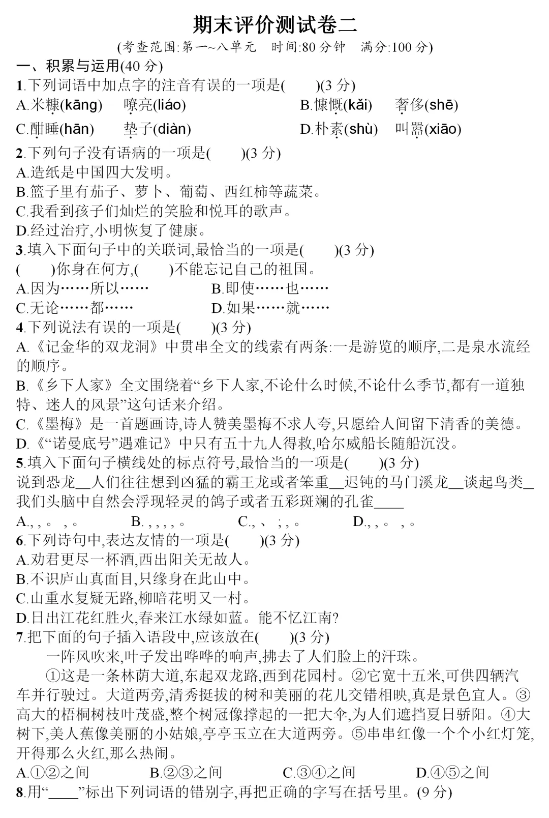 四年级语文第二学期期末检测试卷