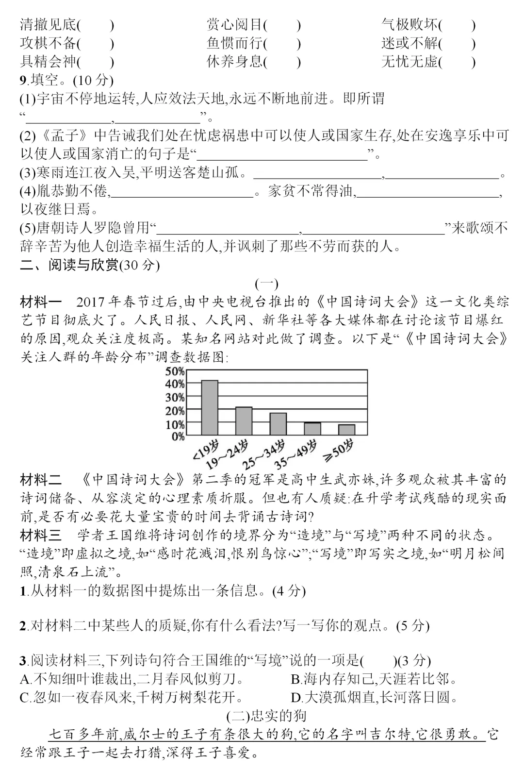 (3)《墨梅》一诗中的名句是“____________________,____________________”。王昌龄用诗句“______________________,______________________”来表达自己______________________________。