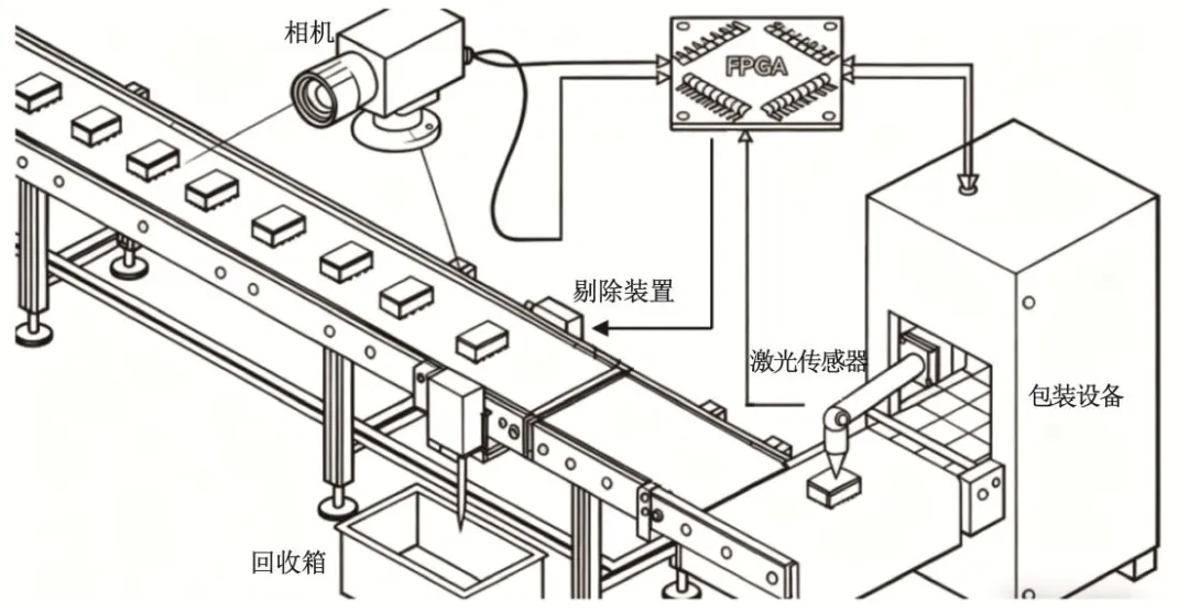如图所示是一种零件检测包装控制系统,包含零件剔除子系统和零件包装子系统。其工作过程是:传送带输送零件时,上方的相机对零件进行图像采集,将图像信息传输至FPGA模块,FPGA对图像进行分析判别,确定零件是否符合要求;若FPGA判别零件为次品,控制剔除装置将零件推入下方的回收箱;若为合格品,传送带继续将其输送至包装工位,由包装设备完成包装。请完成第23-24题。