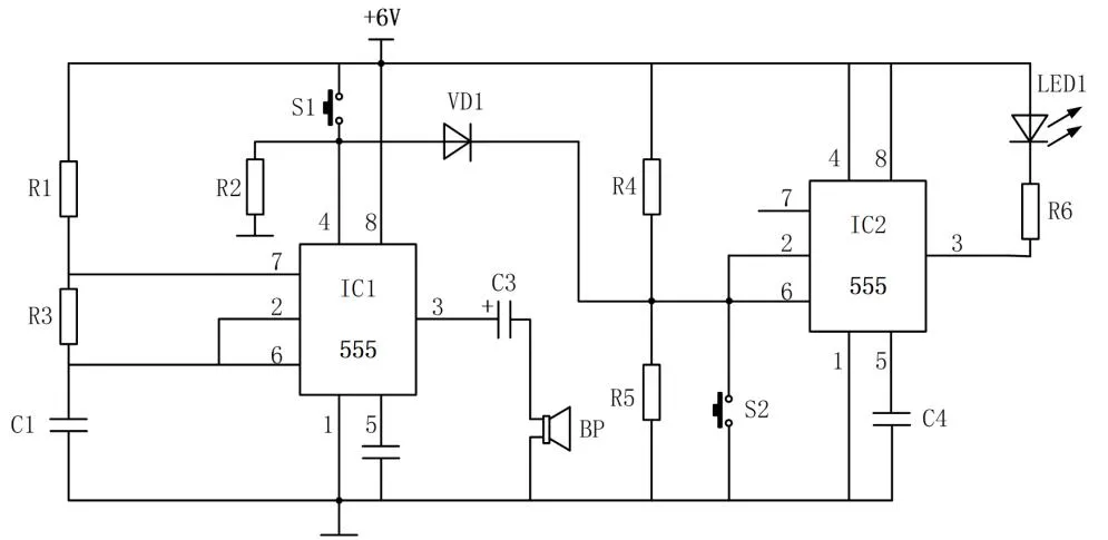 27.小明设计了如图所示的门铃电路。该门铃具有记忆功能:当有人按过门铃后(按下 S1),若家中无人,发光二极管 LED1 保持长时间发光;主人回家后按下复位开关 S2,LED1 才熄灭,以此提示有客人来访。下列分析中不正确的是