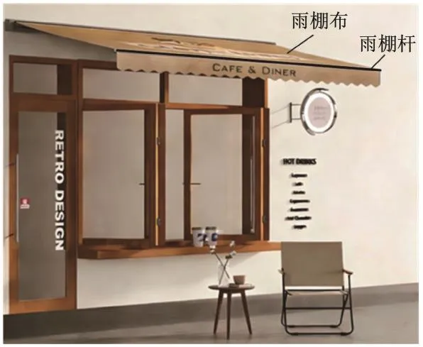 (a)装置能带动雨棚杆展开和收缩,收起时紧贴店铺外墙;