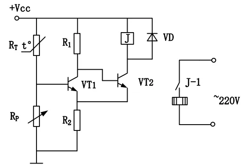 30.小明设计了如图所示的蔬菜大棚温度控制电路,热敏电阻RT检测大棚内的温度,温度低于下限时继电器吸合开始加热,温度高于上限时继电器释放停止加热。电路中的三极管均工作在开关状态。请完成下列各题。