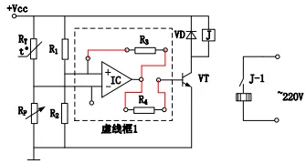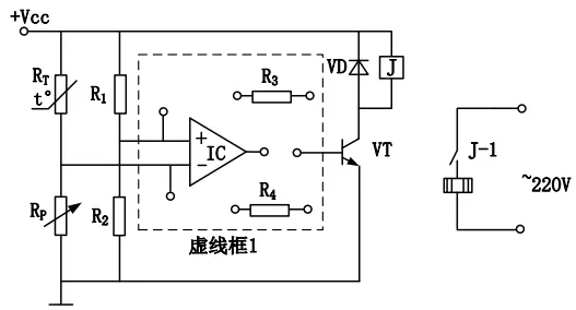 (3)在实践过程中,小明发现一个三极管损坏,于是用比较器重新设计电路,实现温度的区间控制。请在虚线框1中连接给定的元器件,将电路补充完整;
