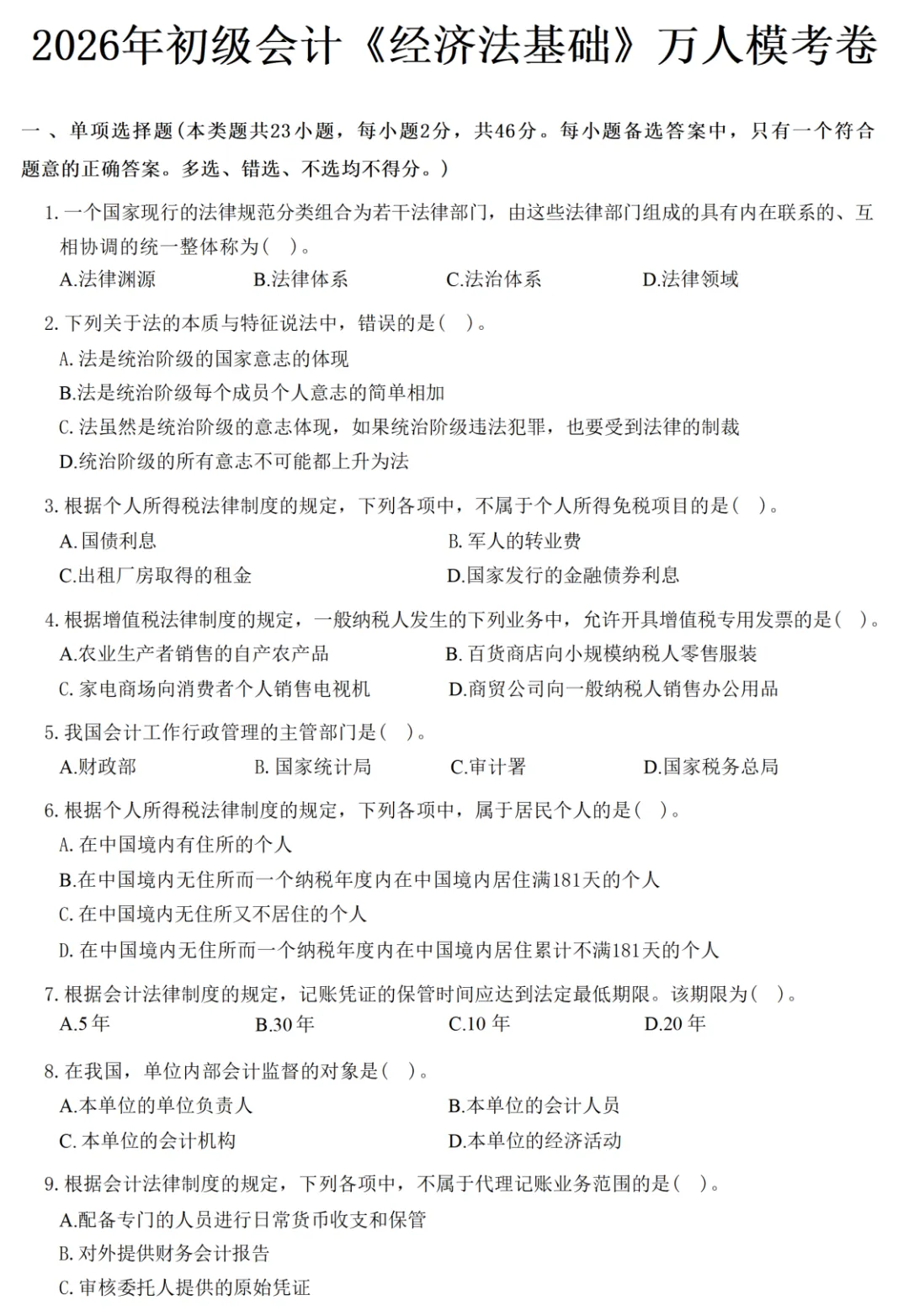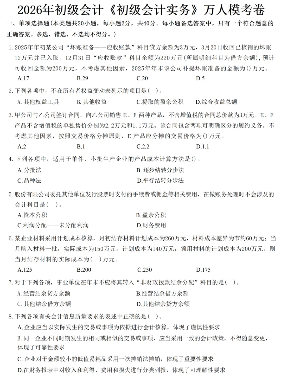 考场如战场,想要拿到好成绩,建议大家没事的时候多刷刷题,先了解自己的薄弱地方,才能查漏补缺,对症下药,为了检验大家的备考成果,小编整理了一套2026年万人模考试卷,一起来答题吧!