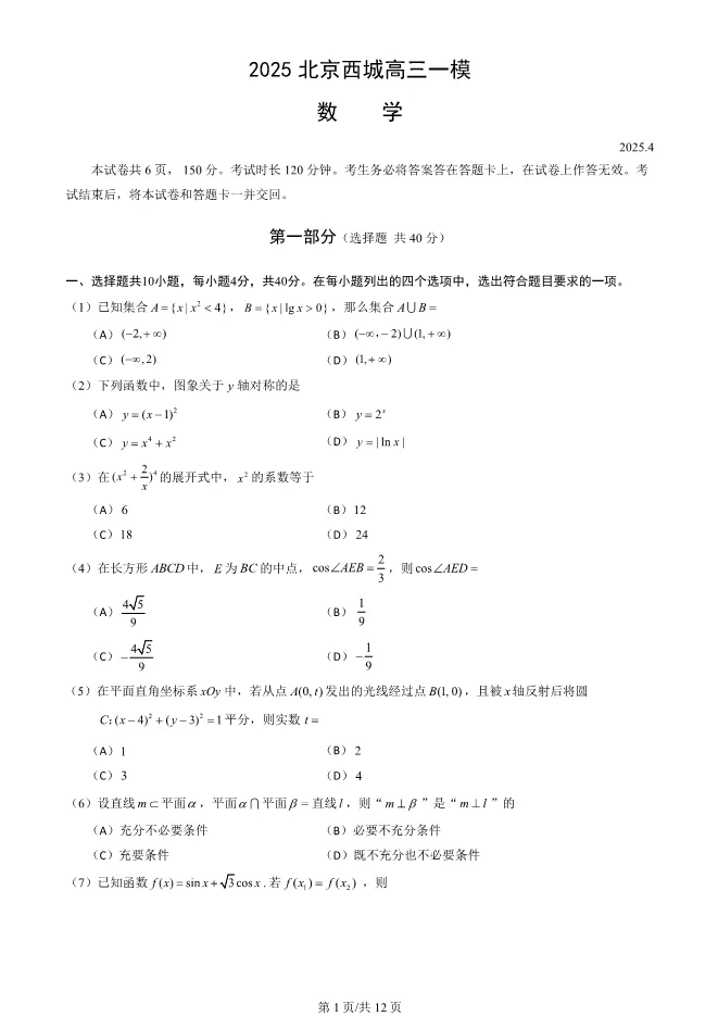 >2025北京西城高三一模数学试卷(有答案)