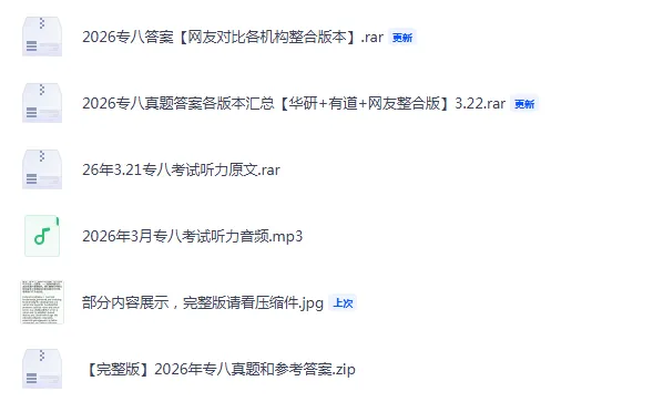 【2026专八真题答案各版本汇总(华研+有道+网友整合版)3.22.rar】点击链接或打开「夸克APP」即可获取。