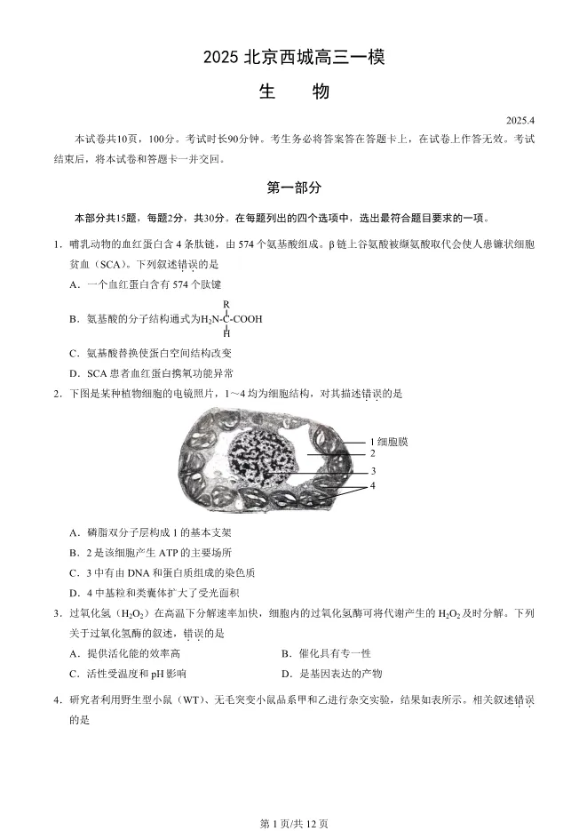 2025北京西城高三一模生物试卷(有答案)