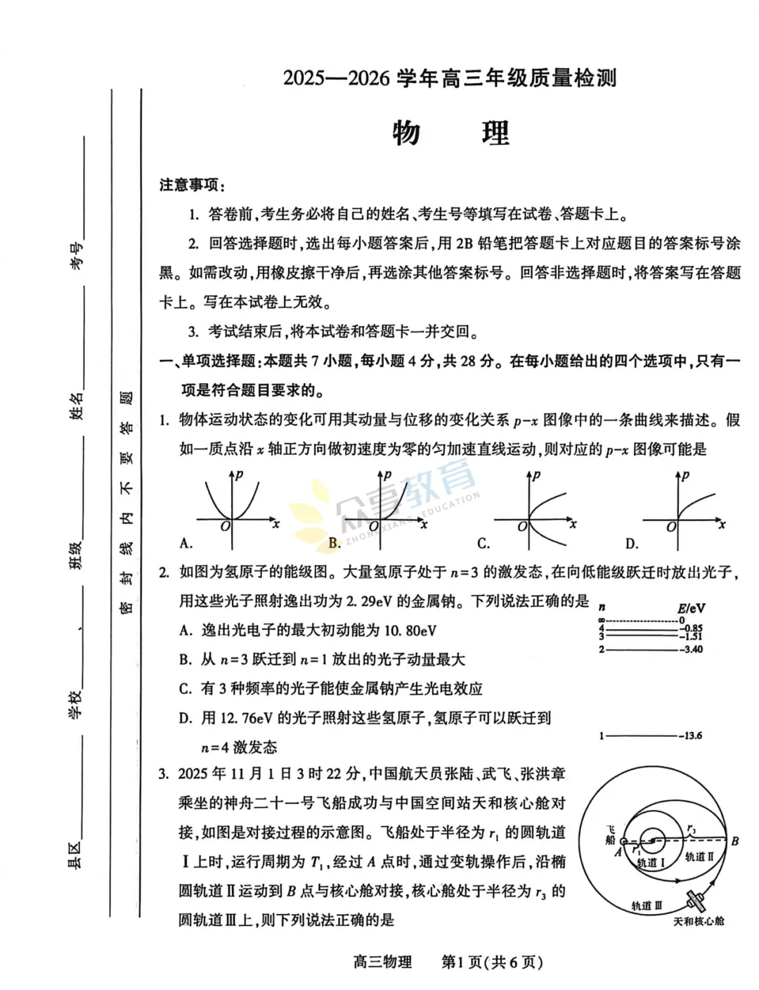 2025-2026学年高三第三次质量检测试卷(物理)