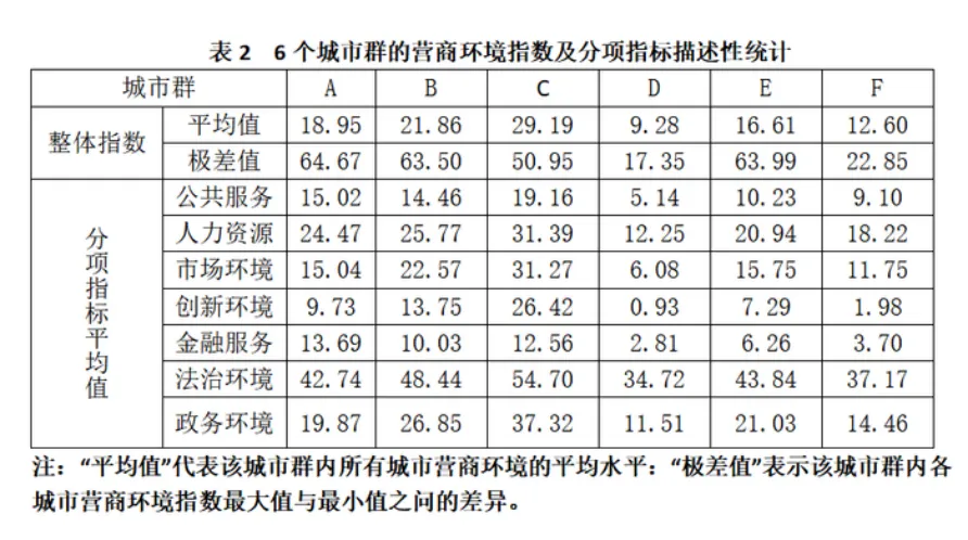 根据表2中的整体指数,分析比较B和F两个城市群的营商环境。(20分)
