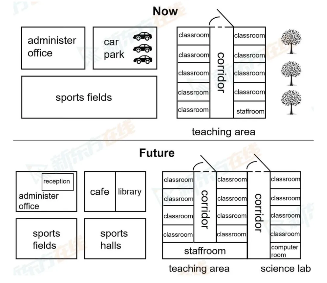 The maps below show the layout of a university as it is now, and plans for its future development.