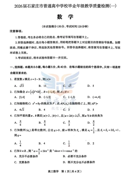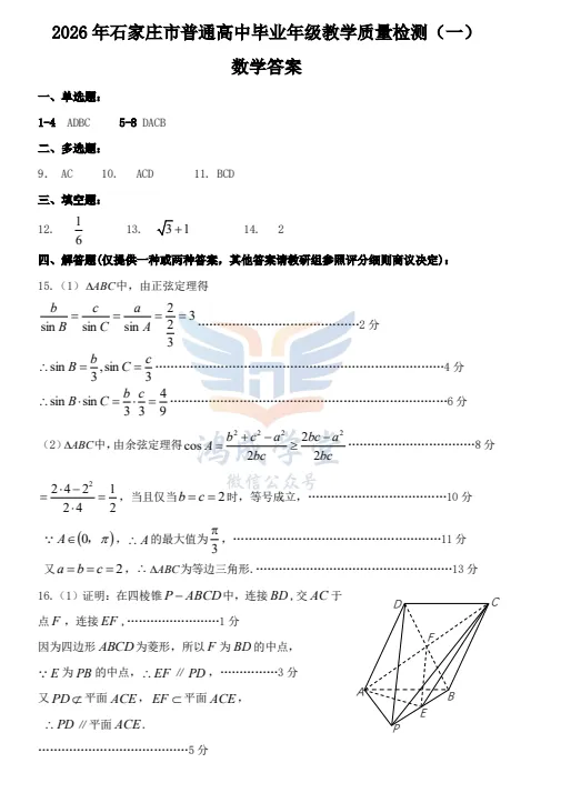 数学试卷-2026届石家庄市高三教学质量检测一.pdf