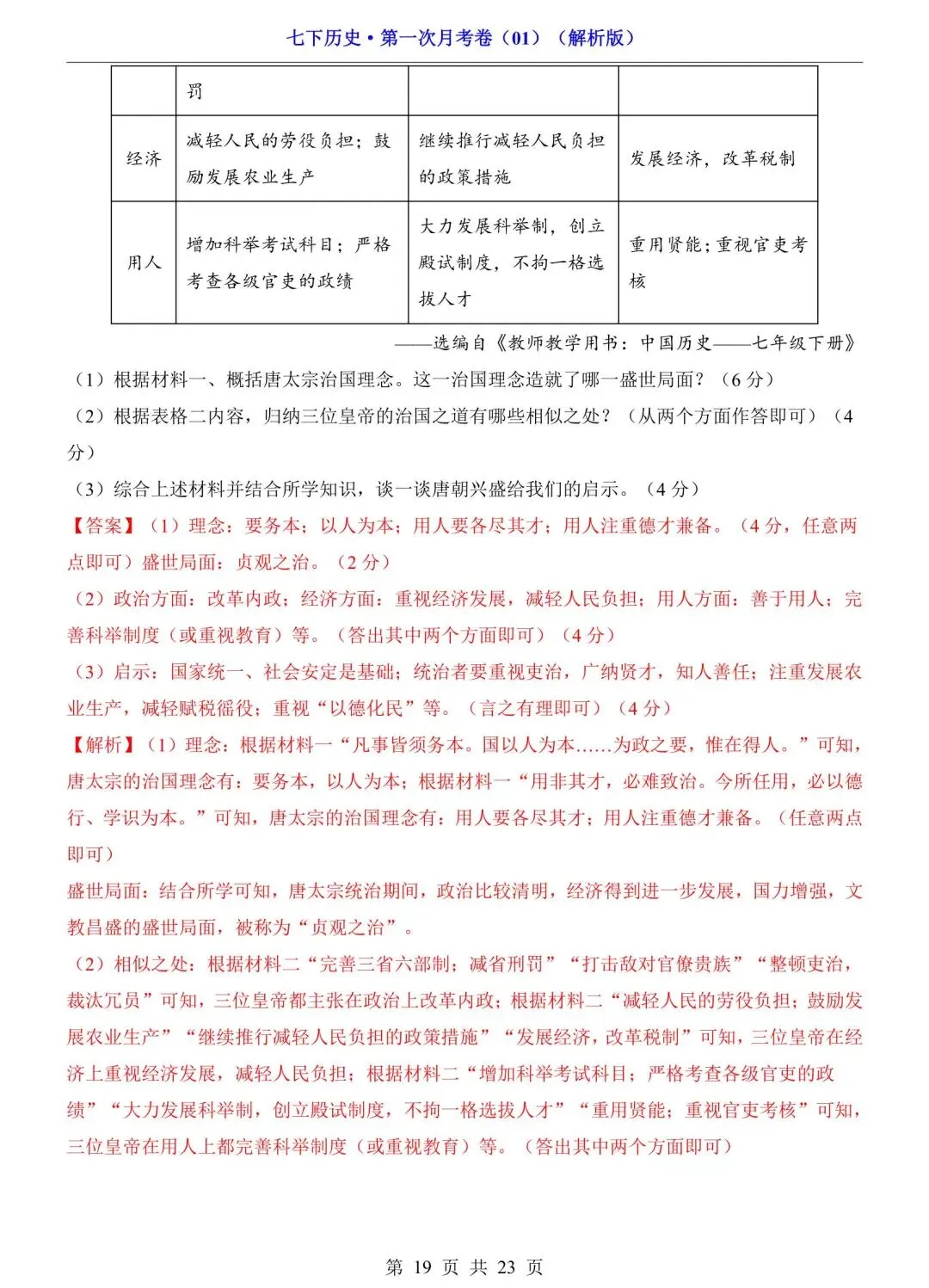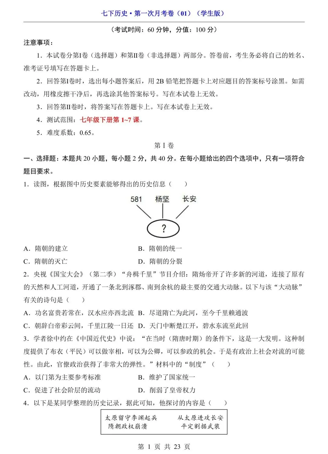>2026七年级下册历史第一次月考试卷(电子版可打印)