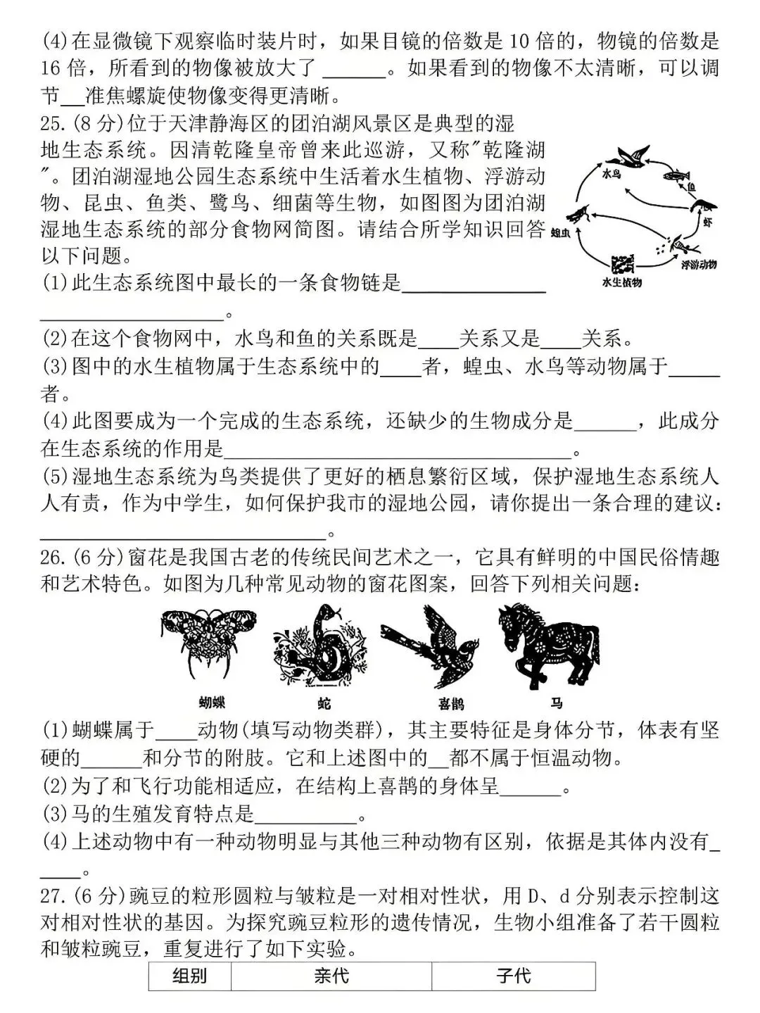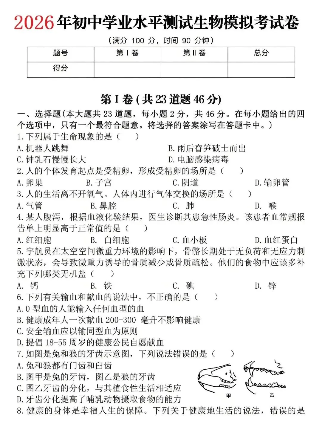 试卷:2026年生物学中考模拟试卷(1)