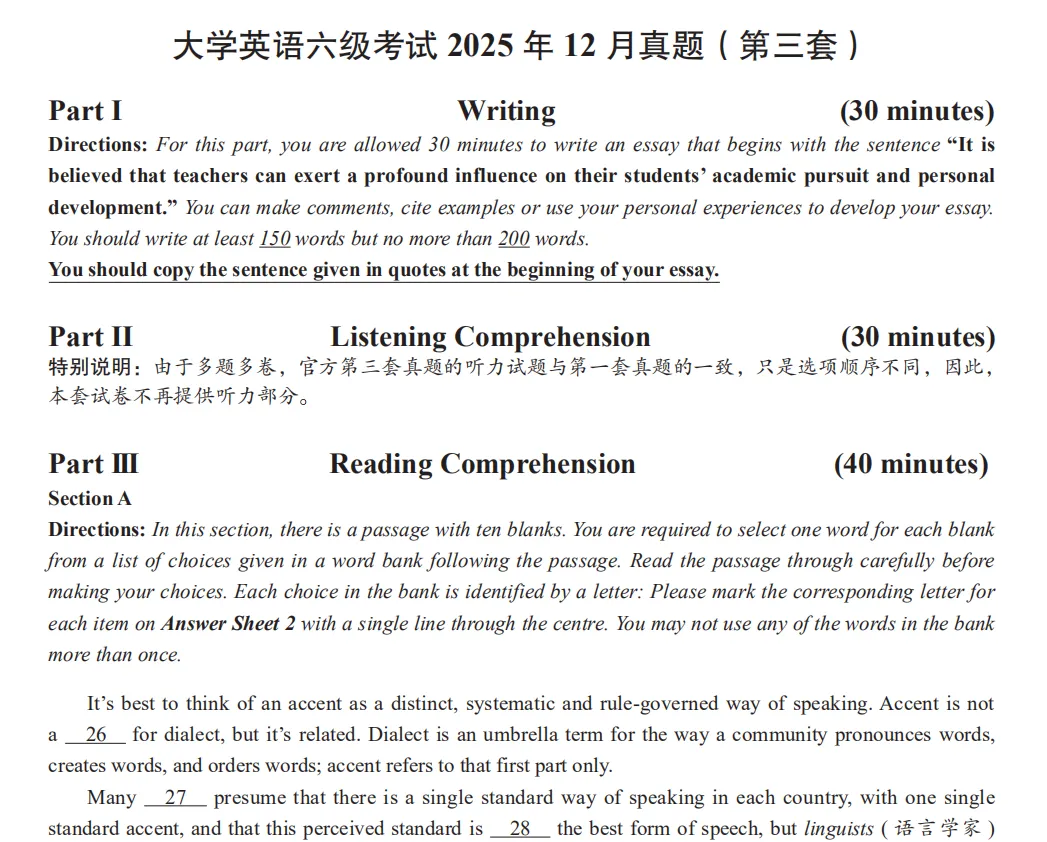 2025年12月的英语六级CET6考试真题试卷、答案解析及听力音频(第一、二、三套全),PDF电子版,可下载打印!通过夸克网盘分享的文件:「2025年12月六级真题及答案」链接:https://pan.quark.cn/s/8ee48cc2ff89