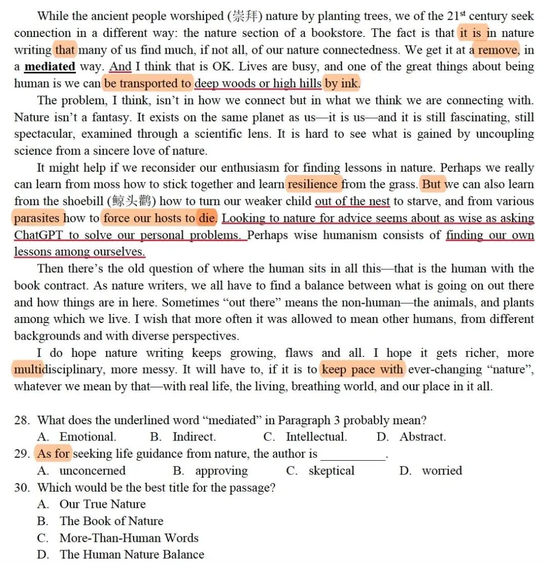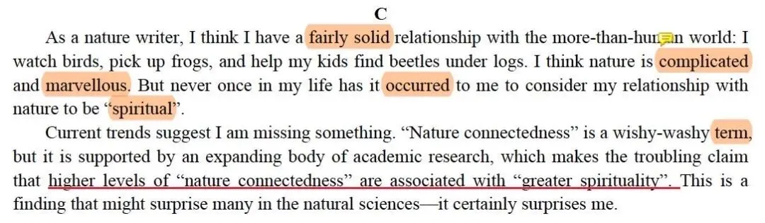 1.nature n. 自然;本质 nature writer(自然作家), nature connectedness(自然联结), real nature(真实自然)2.connectedness n. 联结;联系 nature connectedness(自然联结), higher levels of connectedness(更高层次的联结)3.spirituality n. 灵性;精神性 greater spirituality(更强的灵性), consider my relationship with nature to be “spiritual”4.writing n. 写作;作品 nature writing(自然写作), the nature section of a bookstore(书店的自然类书籍区)5.human adj./n. 人类(的) humanism(人文主义), human sits in all this(人类在这一切中的位置), more-than-human world(超越人类的世界)6.science n. 科学 natural sciences(自然科学), uncoupling science from a sincere love of nature(将科学与对自然的真诚热爱分离)7.balance n. 平衡 find a balance between...and...(在…… 和…… 之间找到平衡)8.perspective n. 视角;观点 diverse perspectives(多元视角)9.multidisciplinary adj. 多学科的 more multidisciplinary(更多元学科的)10.resilience n. 复原力;适应力 learn resilience from the grass(从草中学习复原力)have a relationship with与…… 有关系 / 联系例:I think I have a fairly solid relationship with the more-than-human world.例:But never once in my life has it occurred to me to consider...be associated with与…… 相关联例:higher levels of “nature connectedness” are associated with “greater spirituality”例:We get it at a remove, in a mediated way.be transported to被带到 / 置身于例:we can be transported to deep woods or high hills by ink.uncouple...from...将…… 与…… 分离 / 解开例:uncoupling science from a sincere love of nature例:learn resilience from the grass; learn from the shoebill...例:wise humanism consists of finding our own lessons among ourselves.find a balance between...and...在…… 和…… 之间找到平衡例:we all have to find a balance between what is going on out there and how things are in here.keep pace with跟上…… 的步伐 / 节奏例:if it is to keep pace with ever-changing “nature”例:As for seeking life guidance from nature...wishy-washy term空洞模糊的术语(文中特指 “nature connectedness”)more-than-human world 超越人类的世界nature connectedness 自然联结nature section of a bookstore 书店自然类书籍区deep woods or high hills 深林或高山sincere love of nature 对自然的真诚热爱diverse perspectives 多元视角real life, the living, breathing world 真实生活、鲜活呼吸的世界我是Tia老师,一个努力助力孩子实现梦想的初高中英语老师,关注我,我们一起带孩子英语加油!