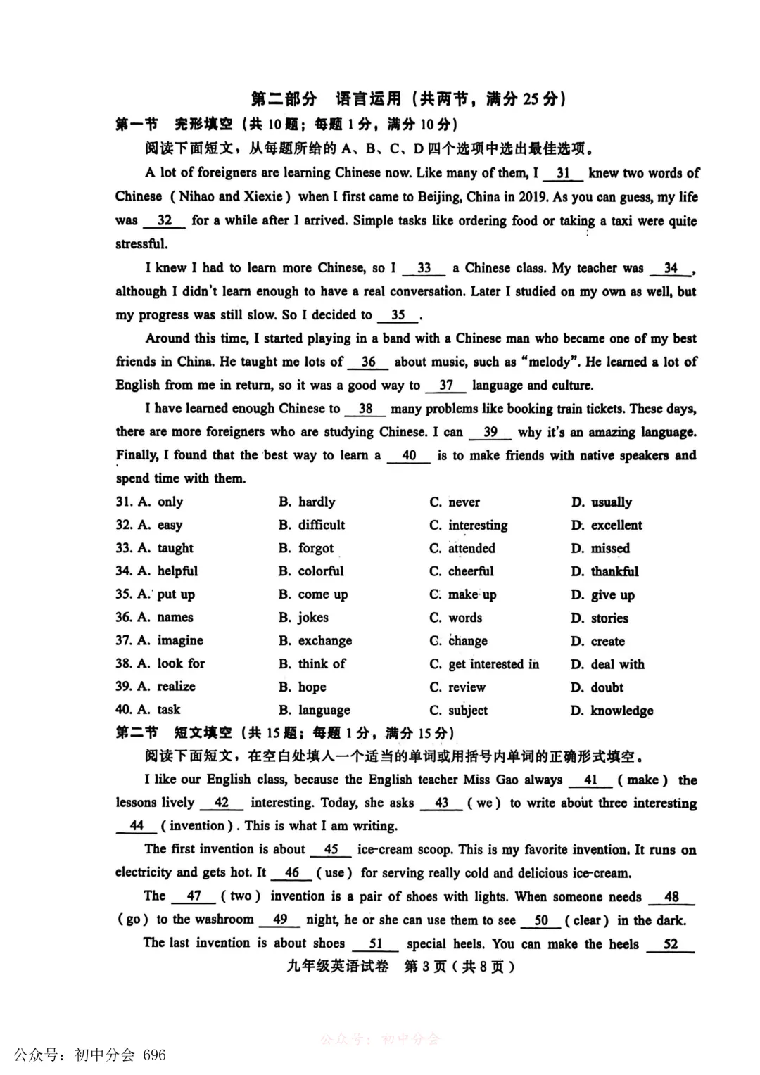 2025-2026学年九年级评估质量监测(三)试卷及答案(全科含听力)