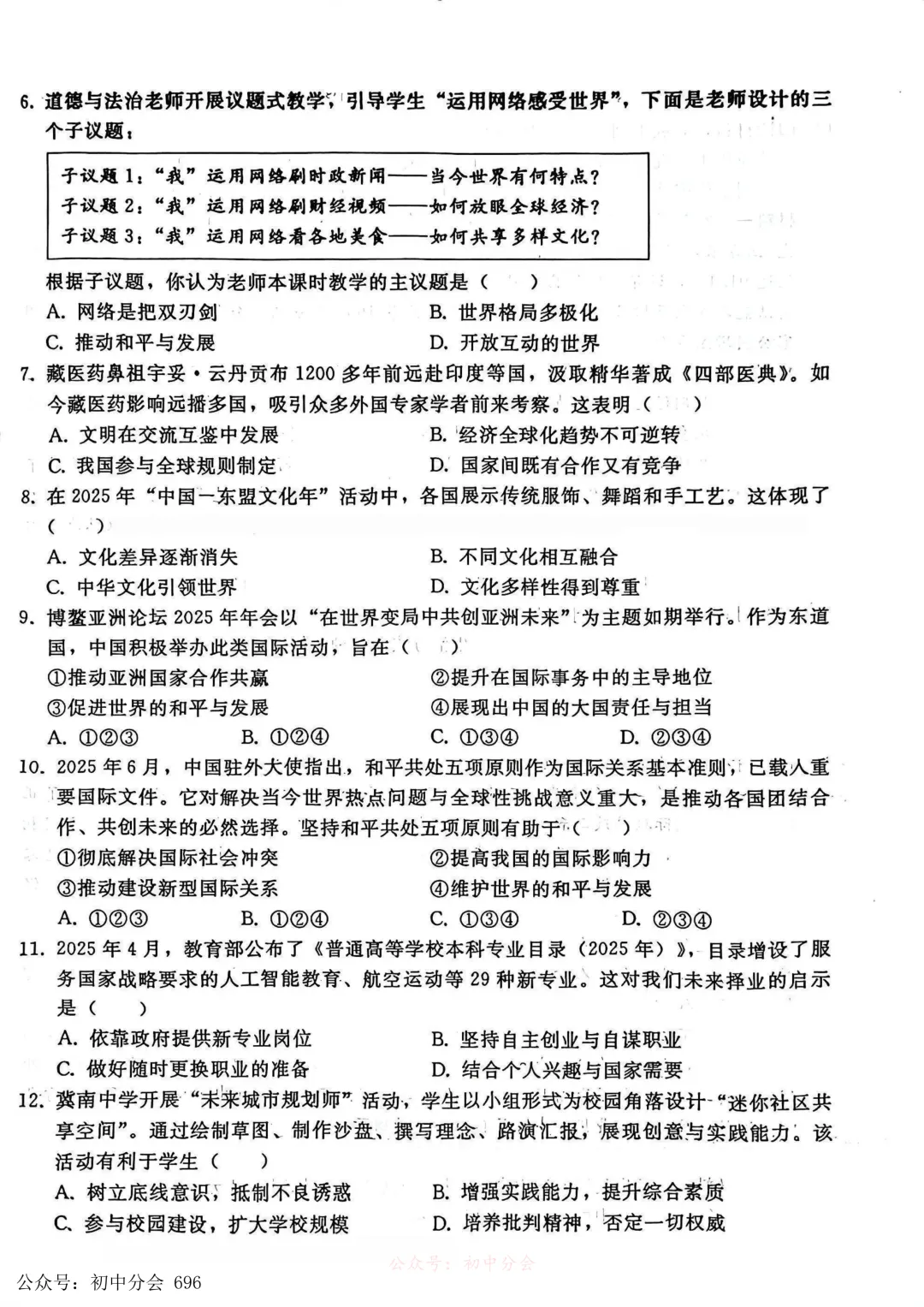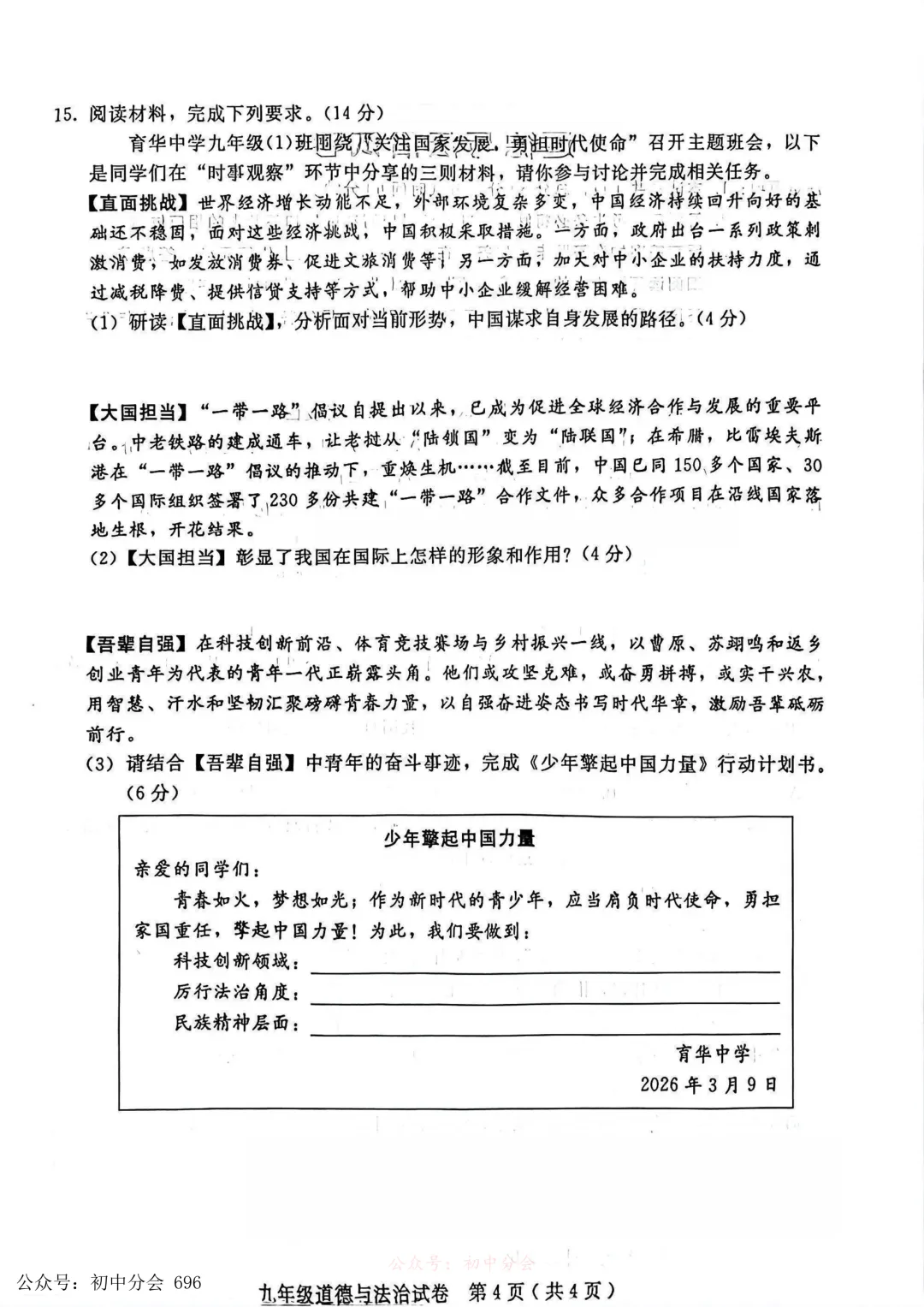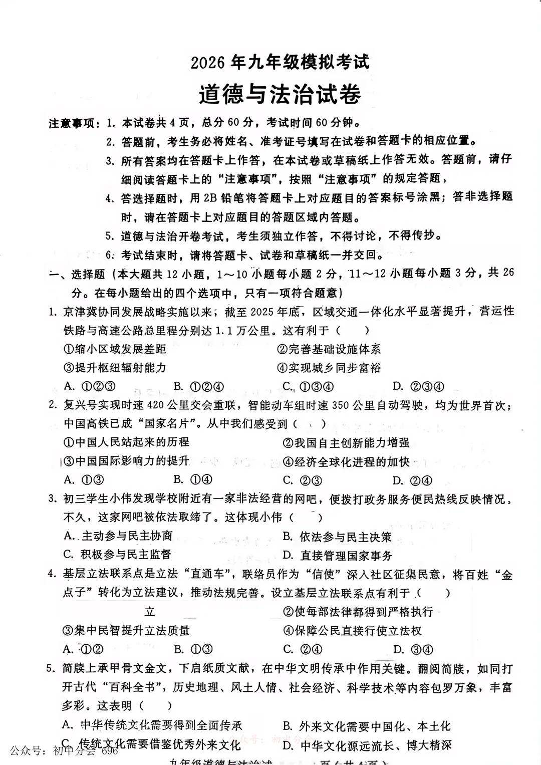2026年安徽省名校之约中考一模道法试卷及答案含听力