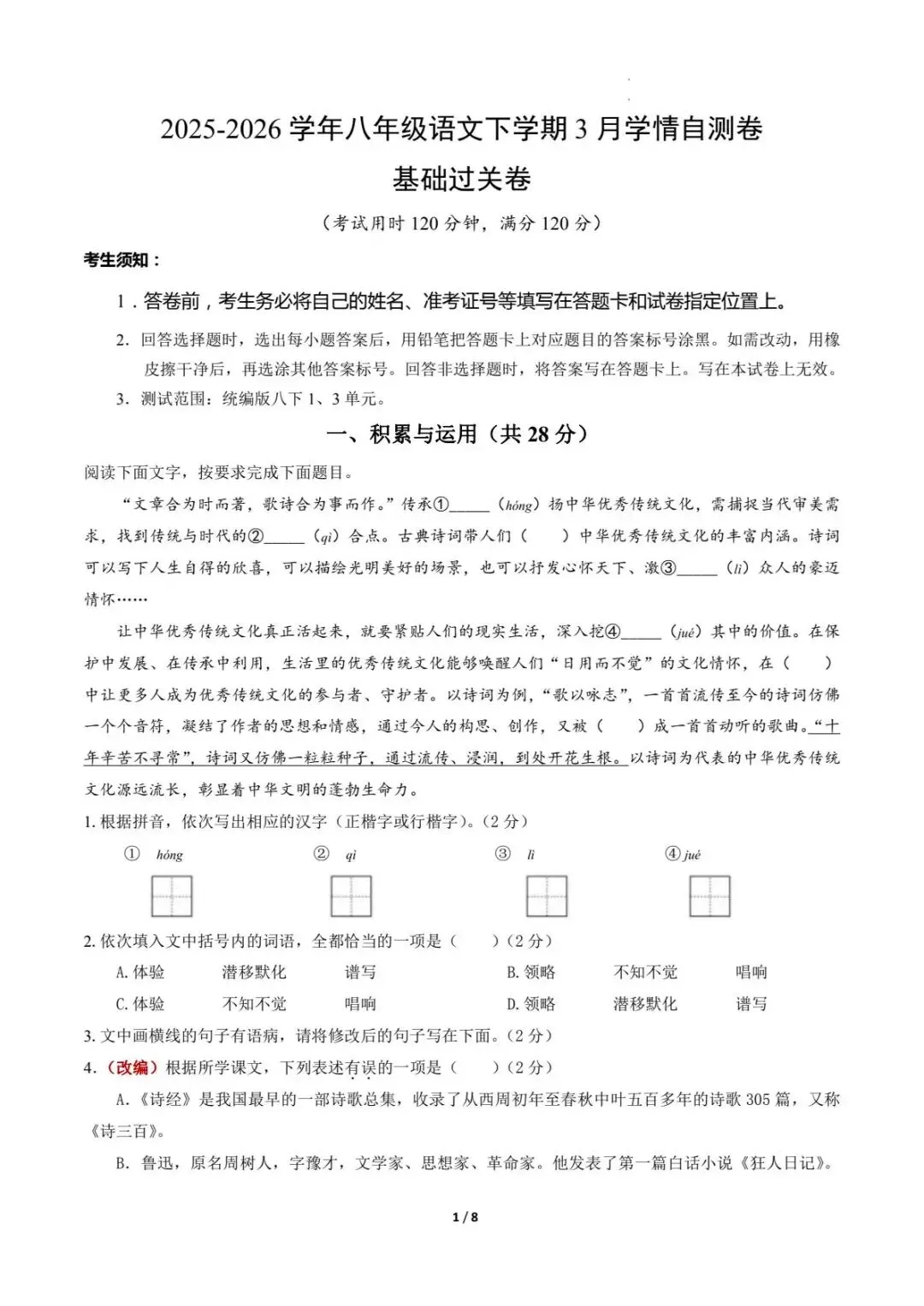今天给大家分享的资料是:2026春七八年级下册全科第一次月考试卷(含案答题卡及答案解析)。语文、数学、英语、地理、历史、物理、生物,多学科多版本,完整pdf电子版可打印。电子版文章末尾可直接领取,无套路,欢迎收藏和下载。