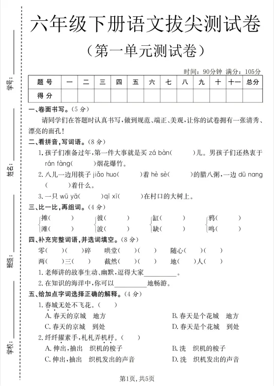 今天给大家准备好了!~六下语文【第一单元拔尖测试卷】丨可下载打印