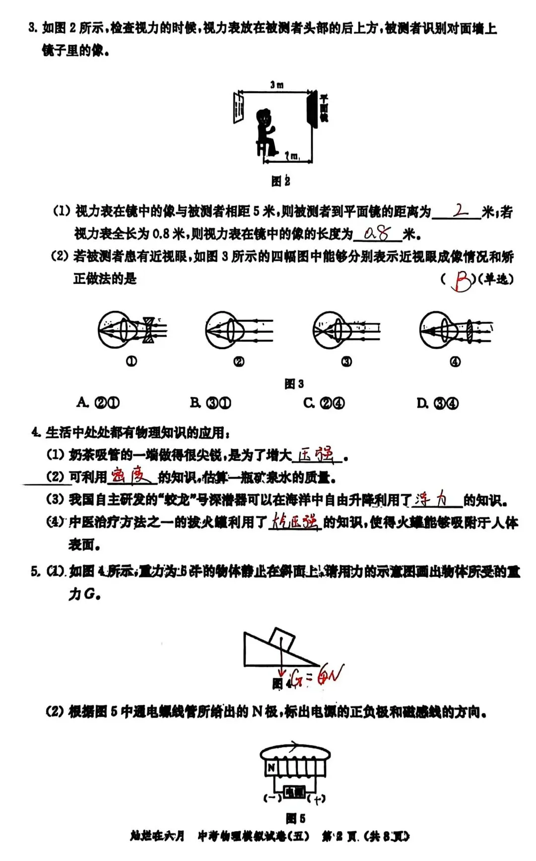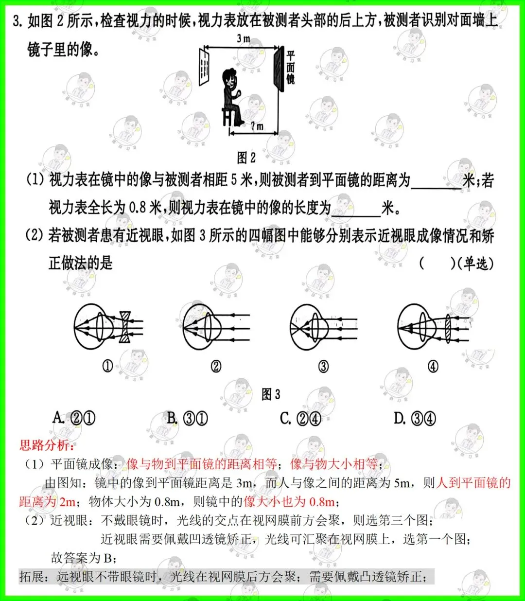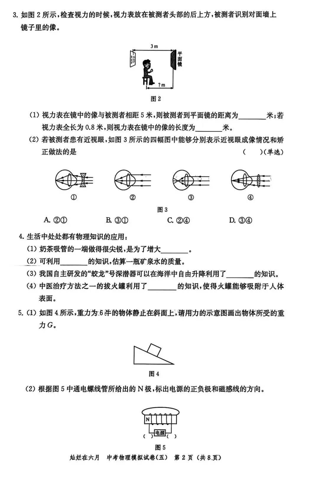 第3题:考查平面镜成像特点,以及眼睛近视原理和矫正的方法;