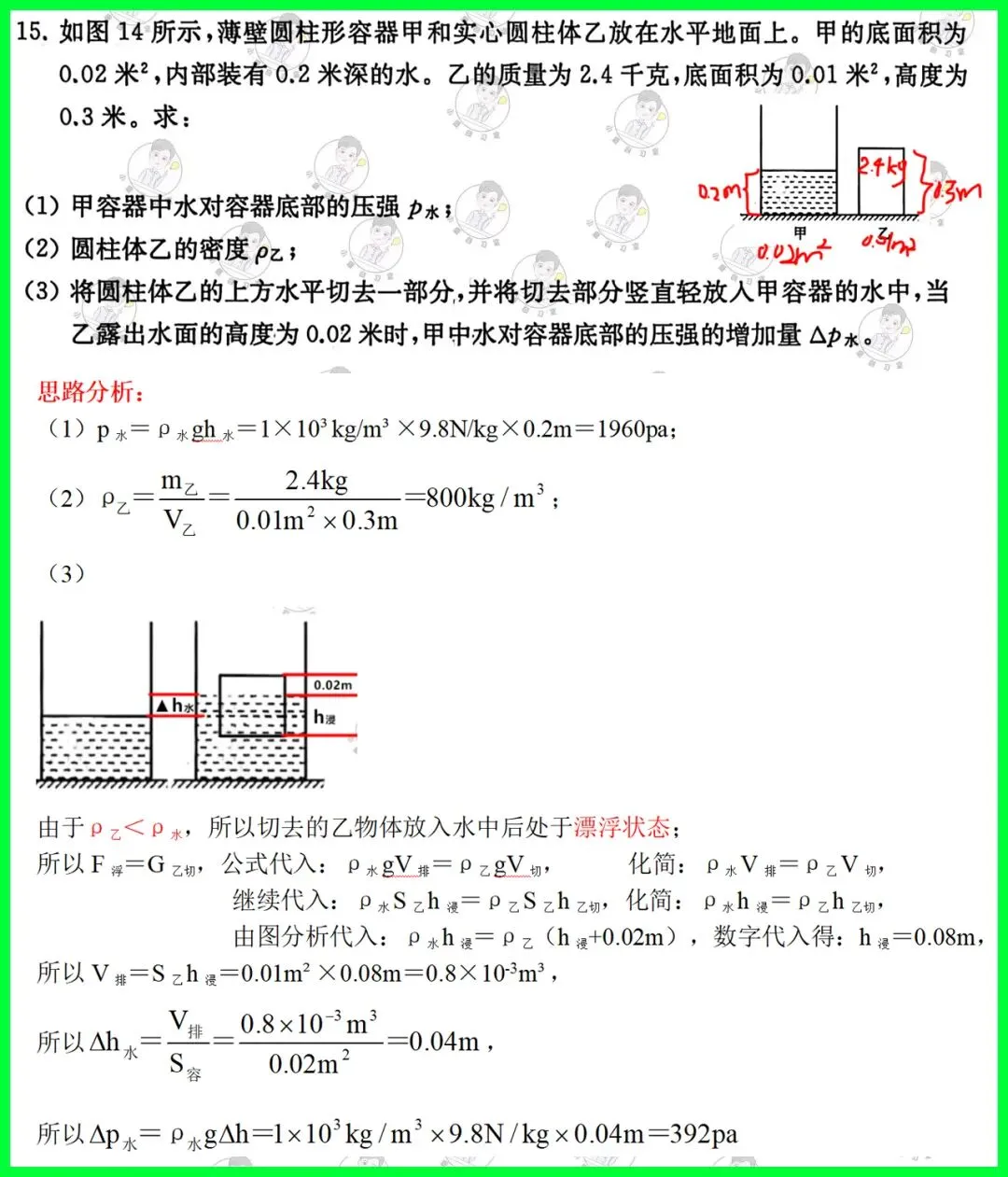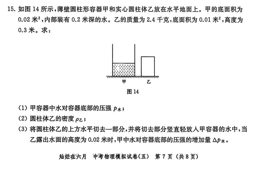 第15题:压强计算题,考查物体在水中的状态以及内部压强的变化量;