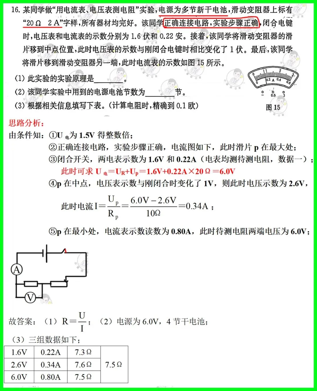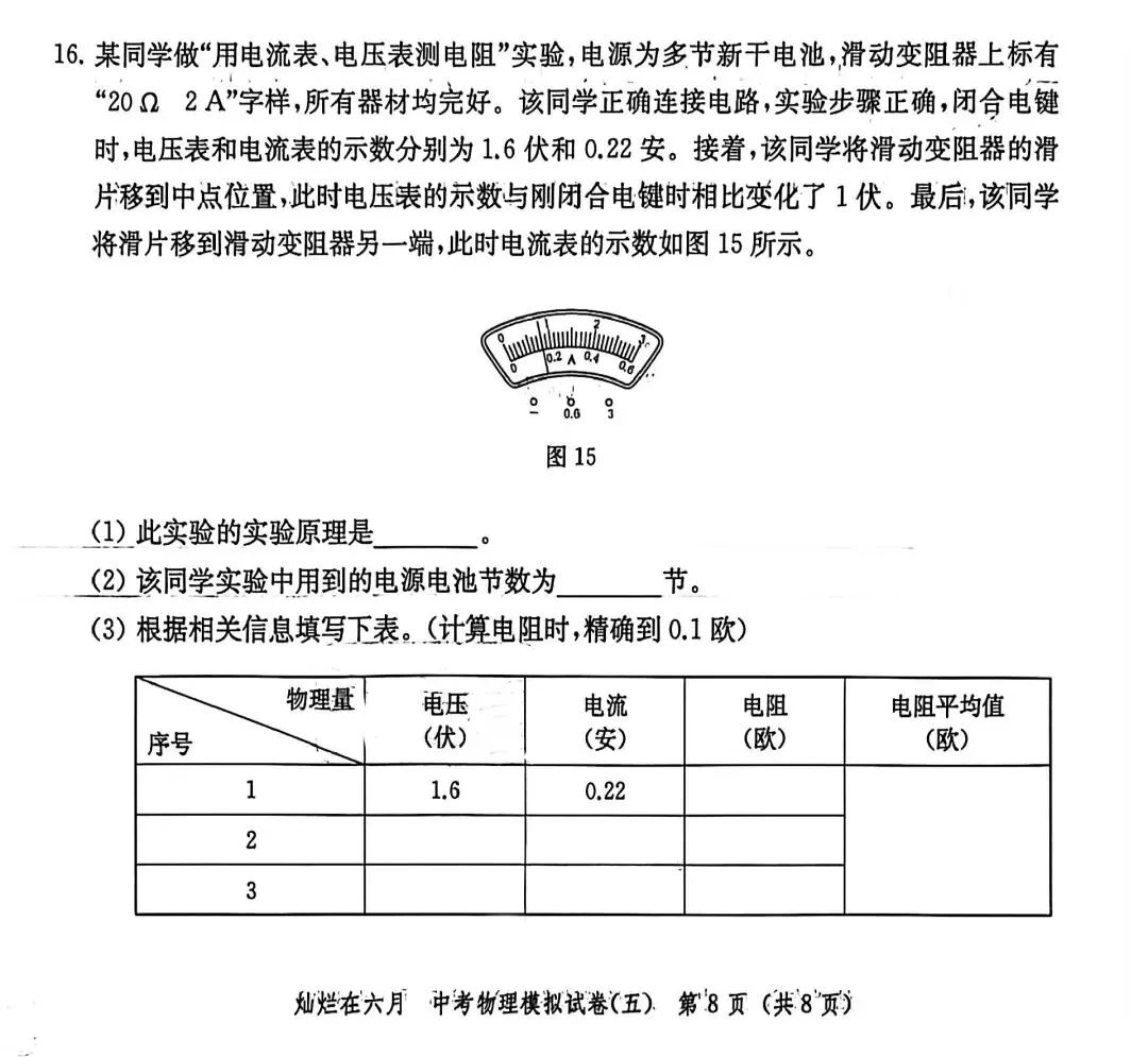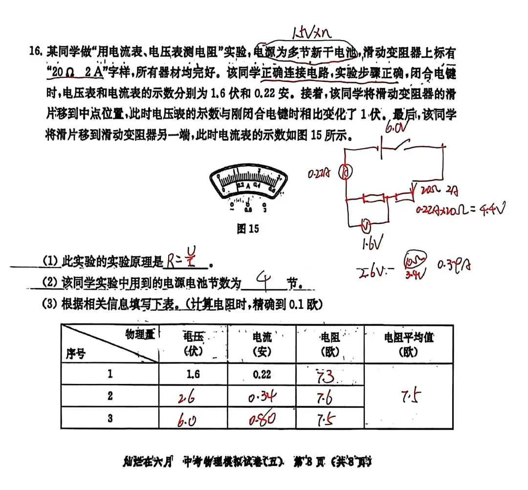 第16题:伏安法测电阻,逐字逐句读题,找准三组数据;