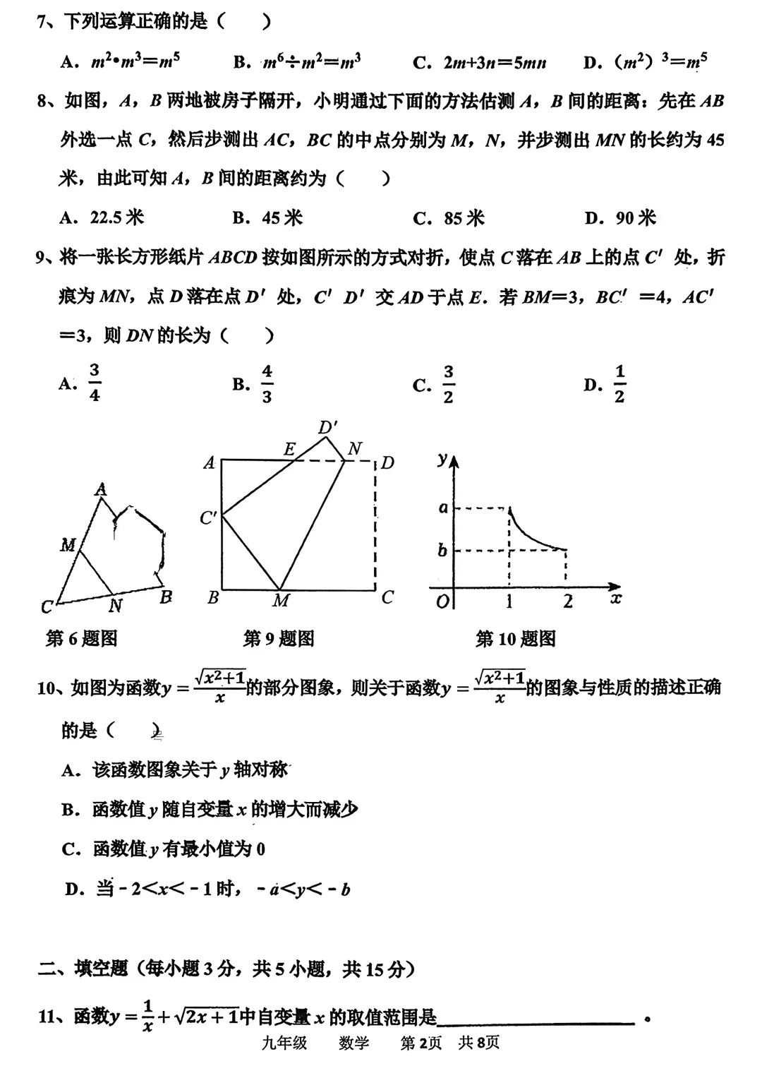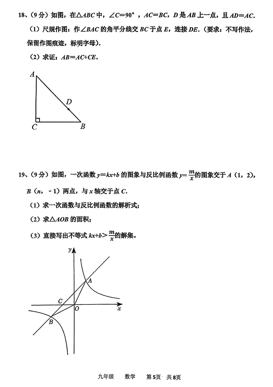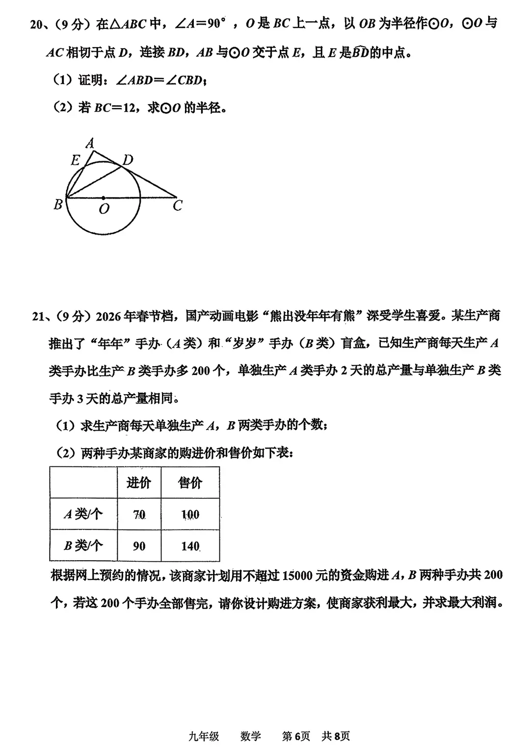 浙江瑞安九下开学考数学试卷️2026.3五校联考