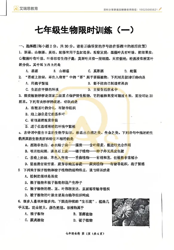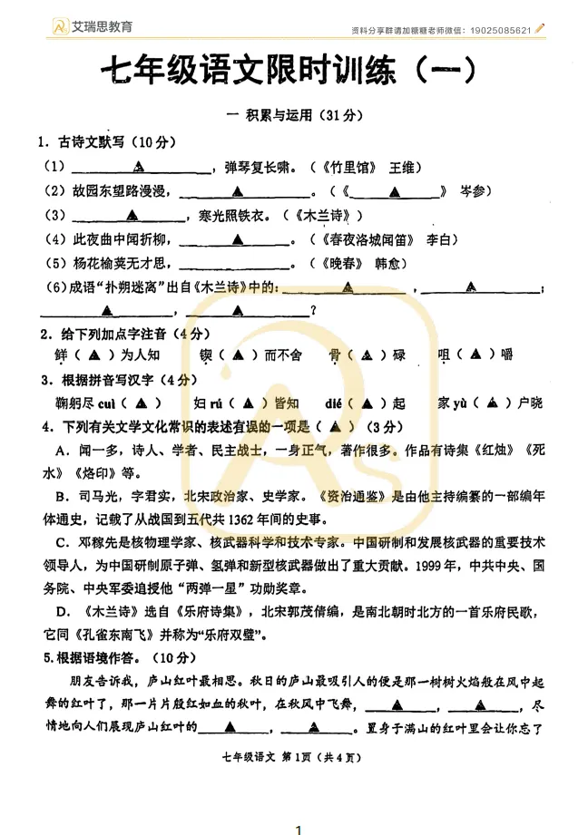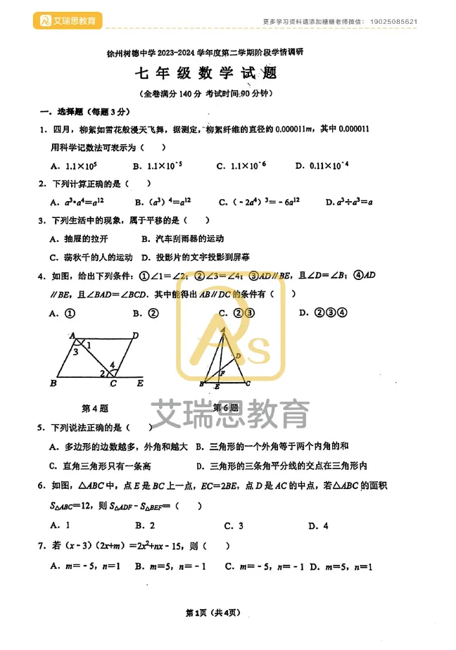 徐州初一下第一次月考真题分享~(电子版可下载)