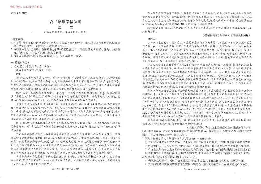 沈阳七中等名校协作体九下,期初联考试卷+答案