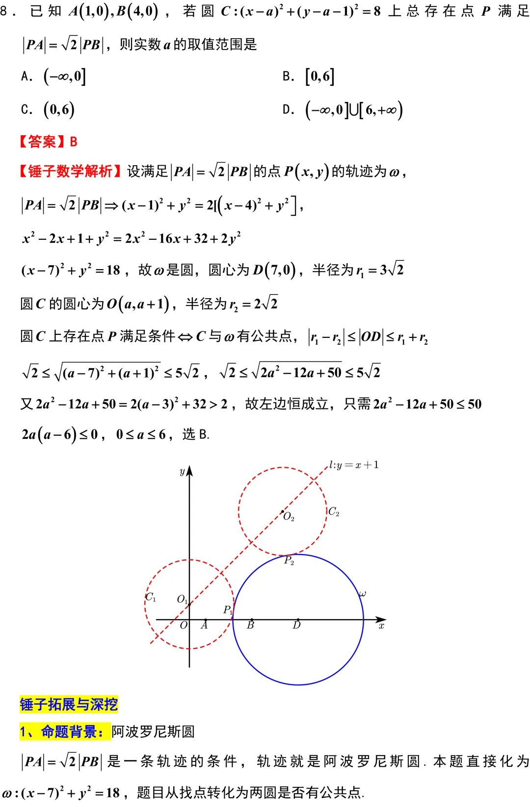 新高考地区刚考完的石家庄一模整张卷子知识点跨度大,难度不低,计算量大。其中第8题,如果没有看出阿波罗尼斯圆,直接在圆上设点硬算,那式子能写满一页,算到最后还不一定对。但如果看到距离比,想到轨迹是圆,那问题变成两个圆有没有公共点,后面的计算就很简单了。