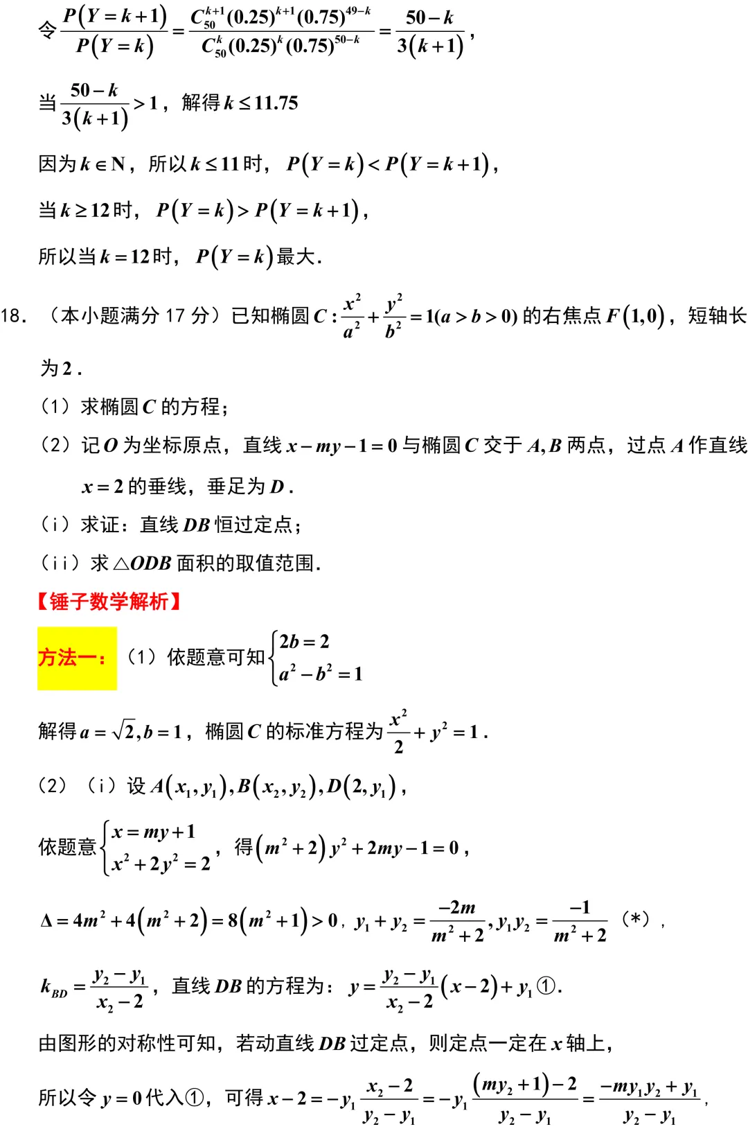 第18题,第一问求椭圆方程是送分,第二问设出直线方程,联立,用韦达定理,一步步走,虽然式子看着长,但方向是清晰的,每一步都有据可循。计算量是有,但不是无脑的堆砌,每一步化简都有它的道理,错一个符号可能就出不来了,要求基本功必须扎实。求面积范围,化简到最后,面积只跟一个参数有关,之前的复杂都化成了简单。