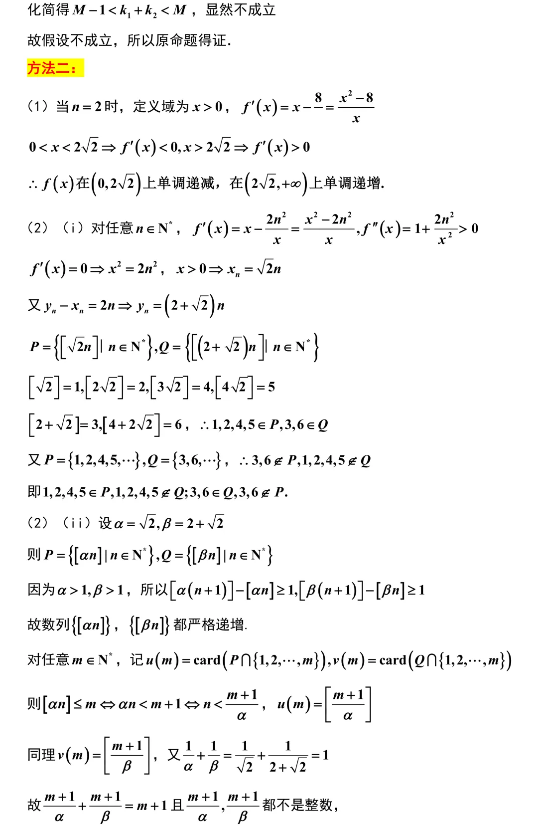 第19题,前两问求导、求极值点,都是常规操作,第三问,它突然拐了个弯证明两个集合是“互补覆盖”。借助Beatty定理的结论,一下子就豁然开朗了。这其实就是数学的魅力所在:一个看似和导数无关的问题,最后却能用导数的思想来解。