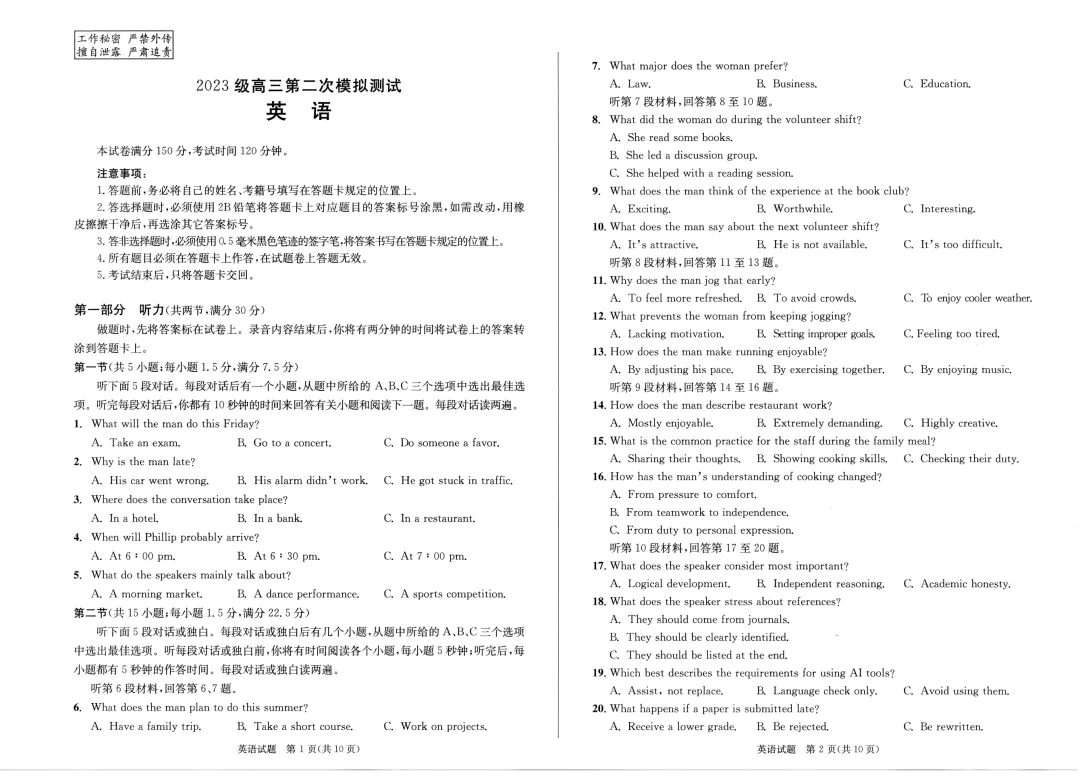 小编今天继续给大家更新26届成都二诊考试的试卷+参考答案,PDF电子版,有需要的家长/同学快来找我领取吧~~