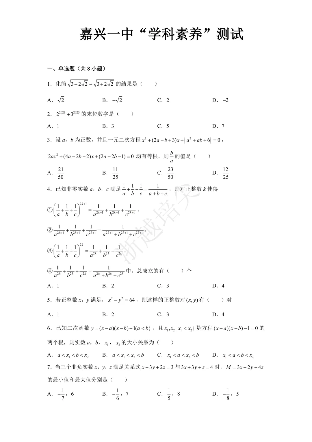 2025年杭州学军中学提前招生考试数学试卷