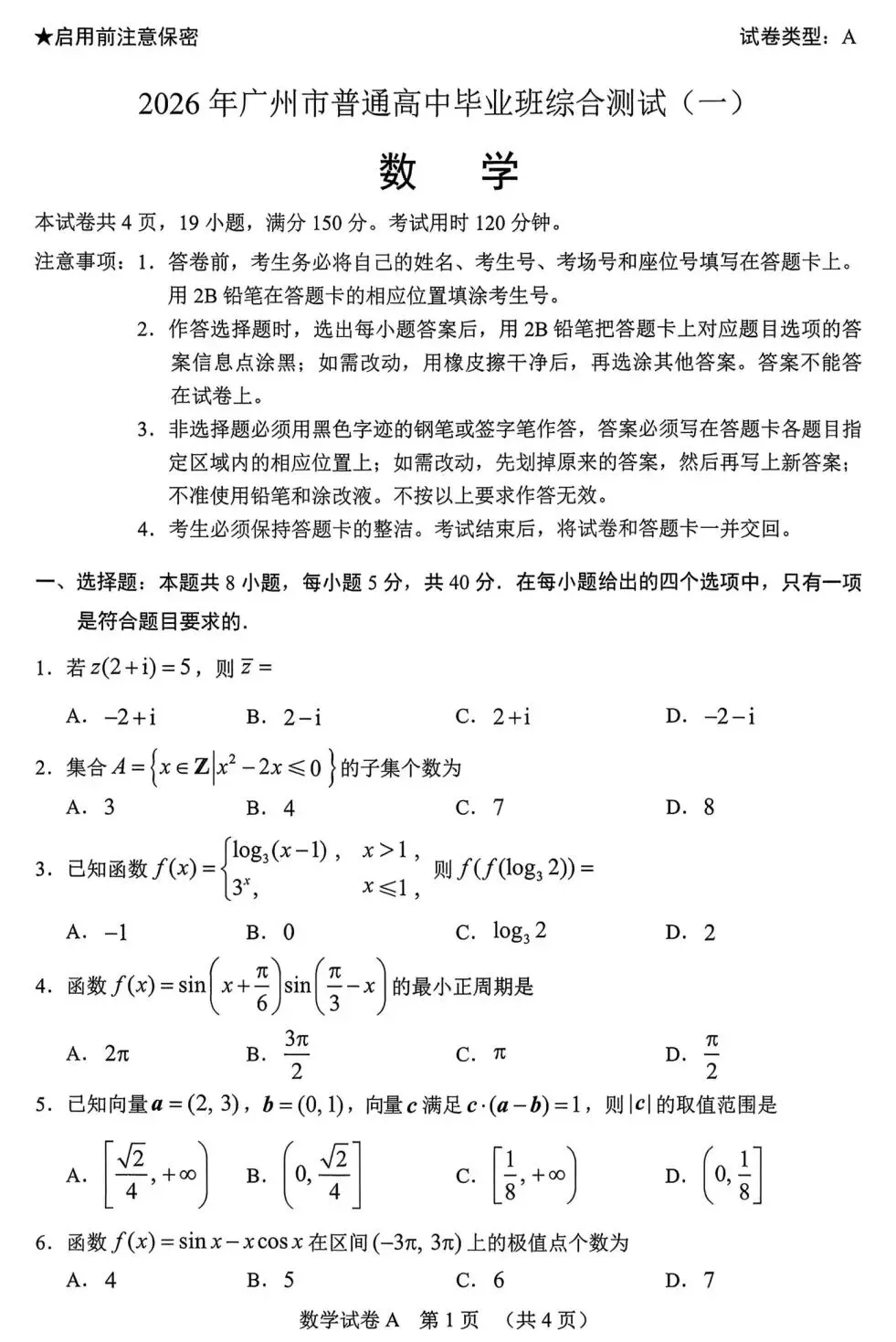 2026届高三广州一模数学试卷及答案