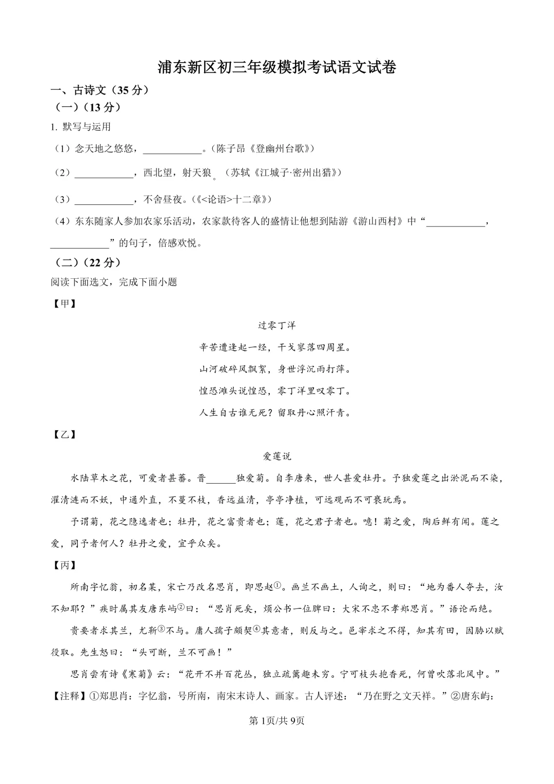 2025届上海市浦东新区初三二模语文试卷(原卷版+解析版)