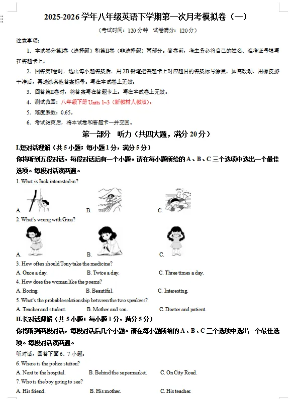 >26春新人教八下英语月考试卷2套(含听力音频+答题卡+答案)