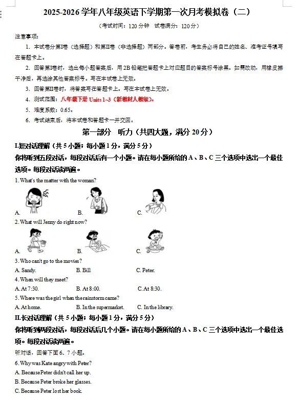 26春新人教八下英语月考试卷2套(含听力音频+答题卡+答案)
