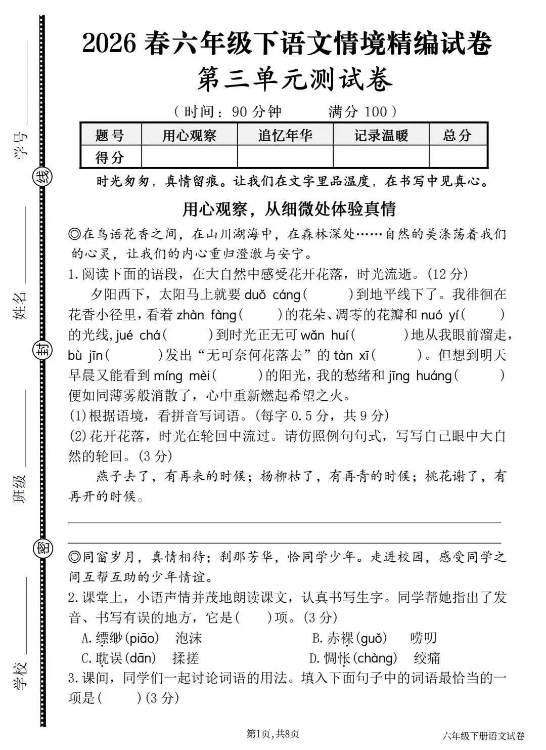 >2026春六下语文第三单元情景精编试卷