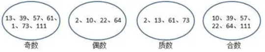 10、将2、10、13、22、39、64、57、61、1、73、111按要求填入下面的圈内。
