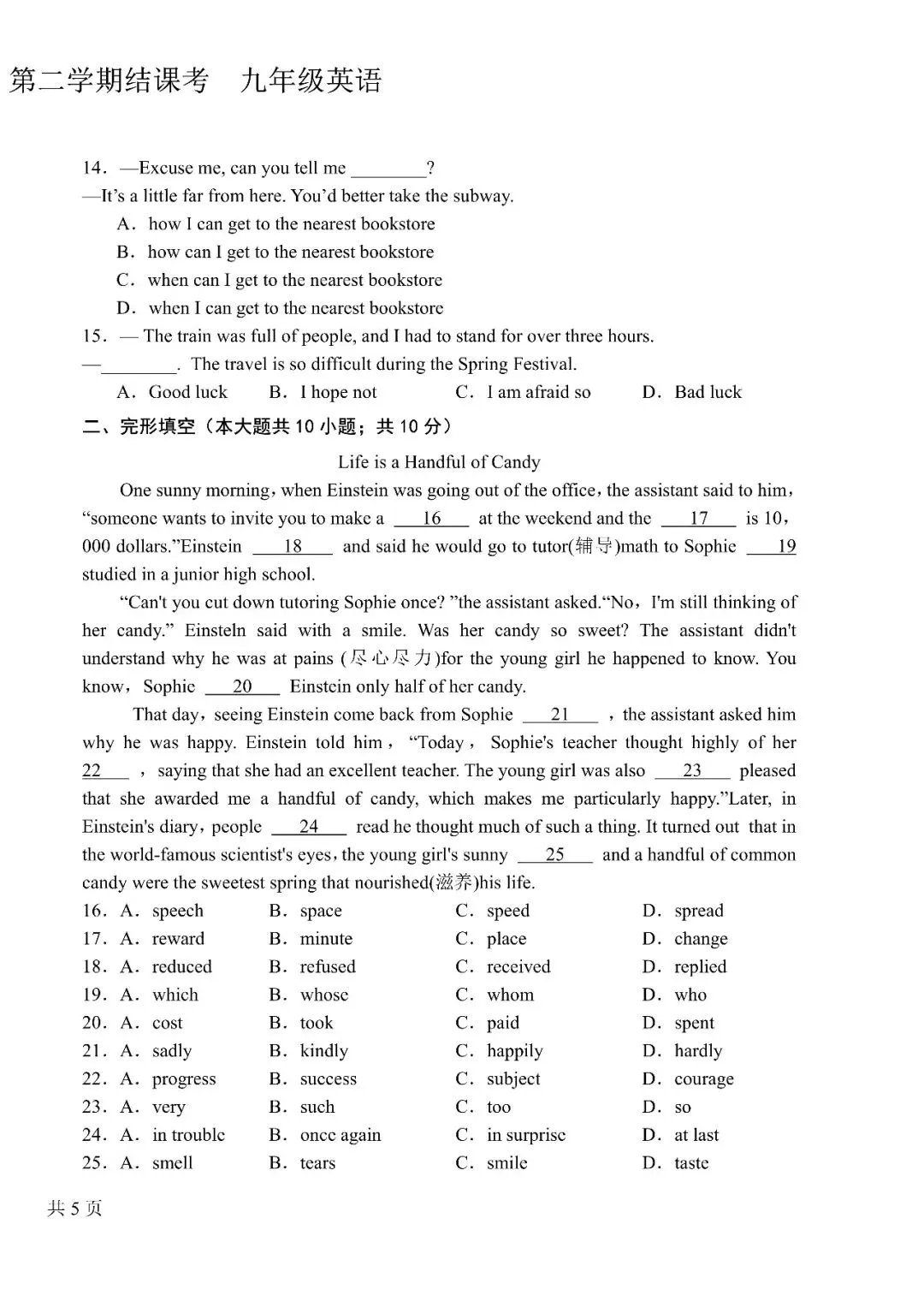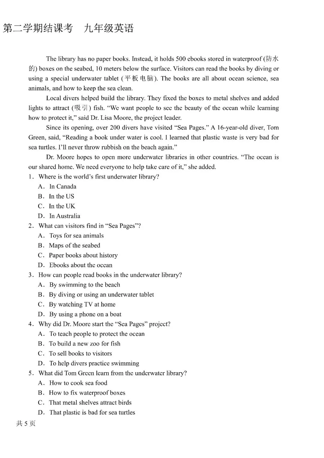 九年级结课考试试题及答案