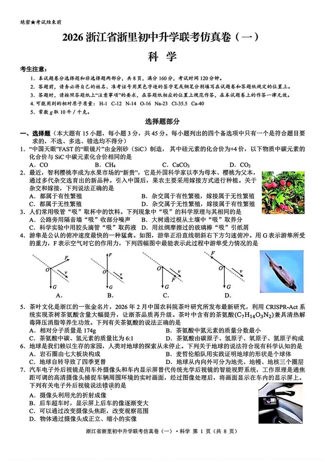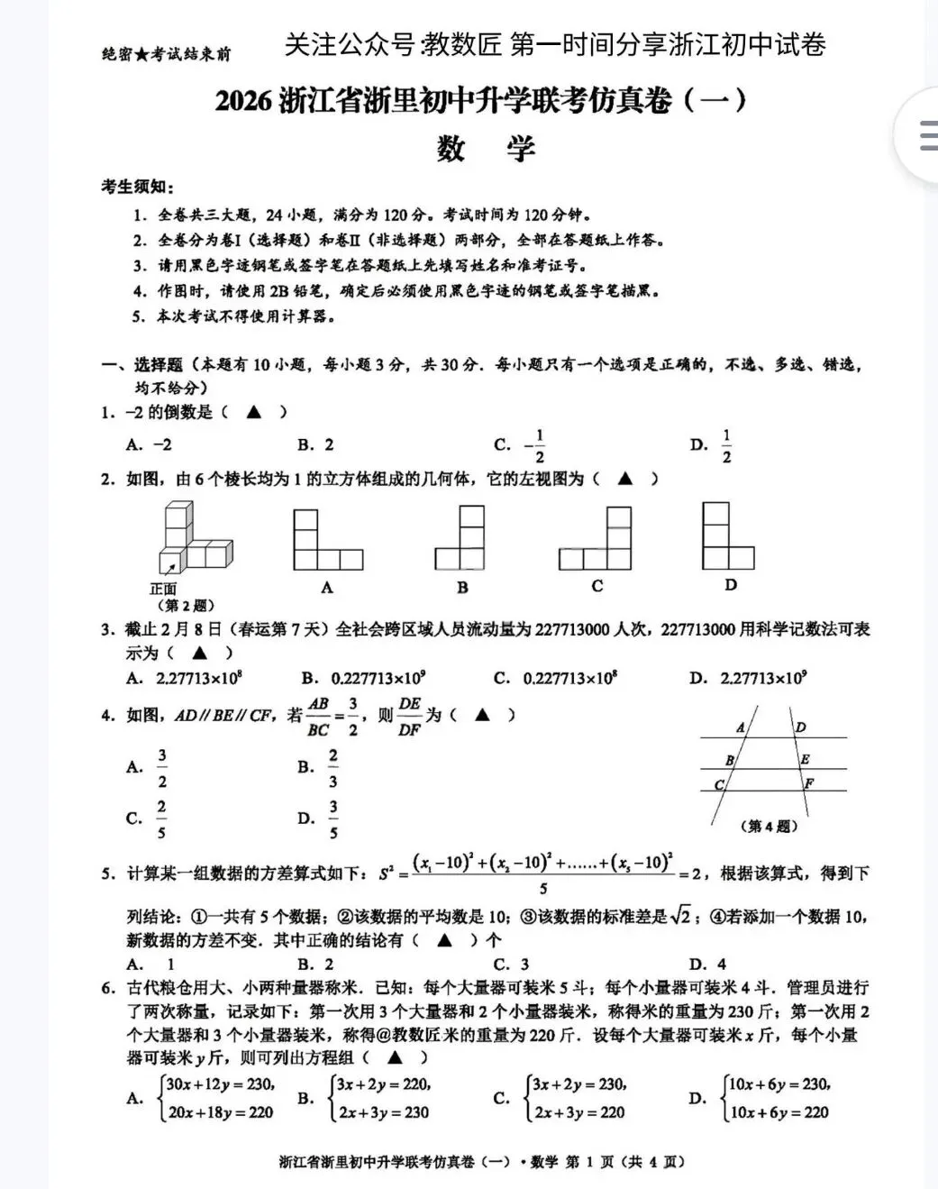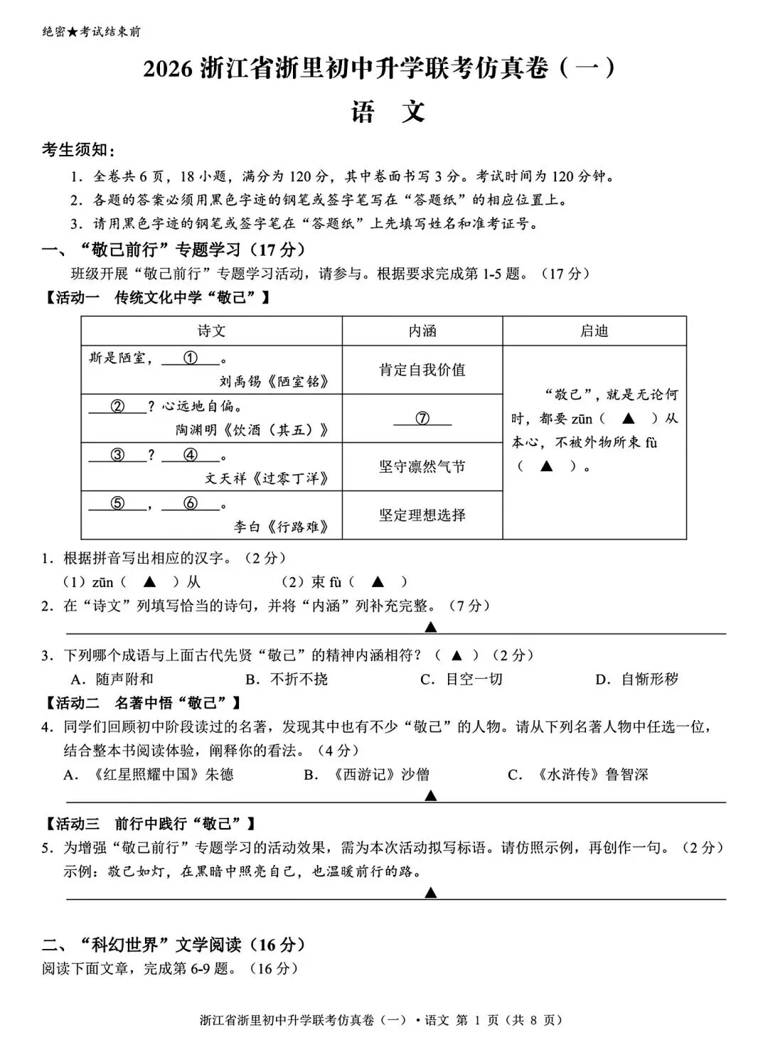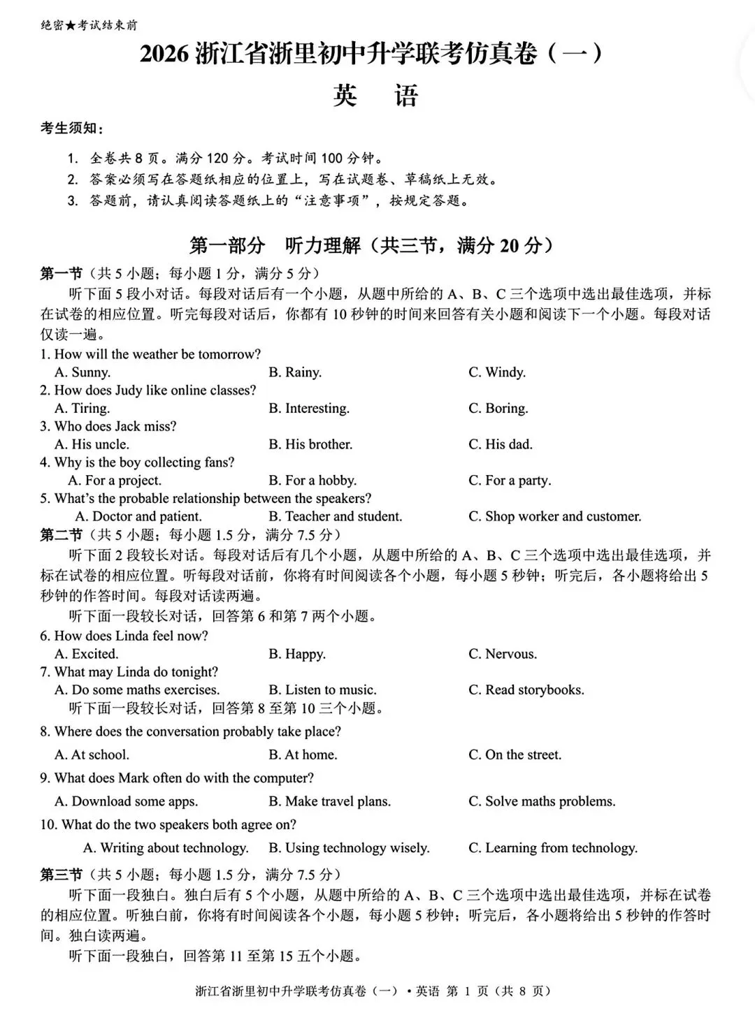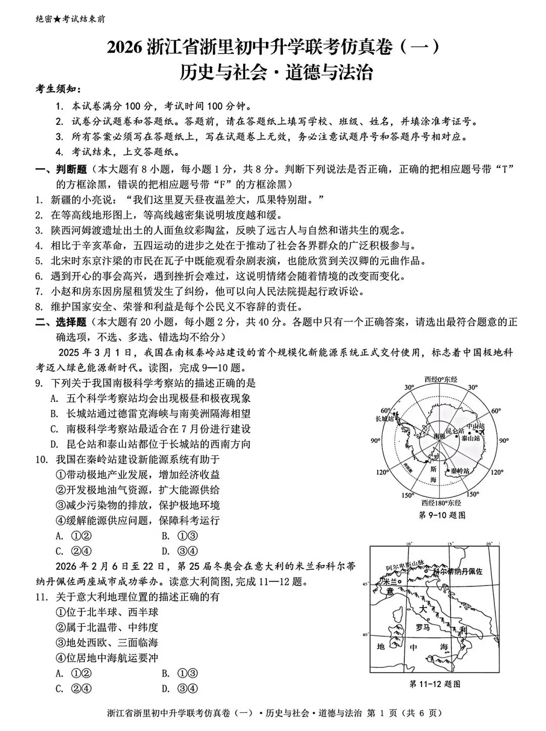 文末可下载电子版试卷—————————————————— ⏬浙江初三家长可进群⏬—————————————————— 【2026浙江中考必备】纸质版包邮——————————————————公众号回复:2026浙里仿真卷1领取电子版试卷