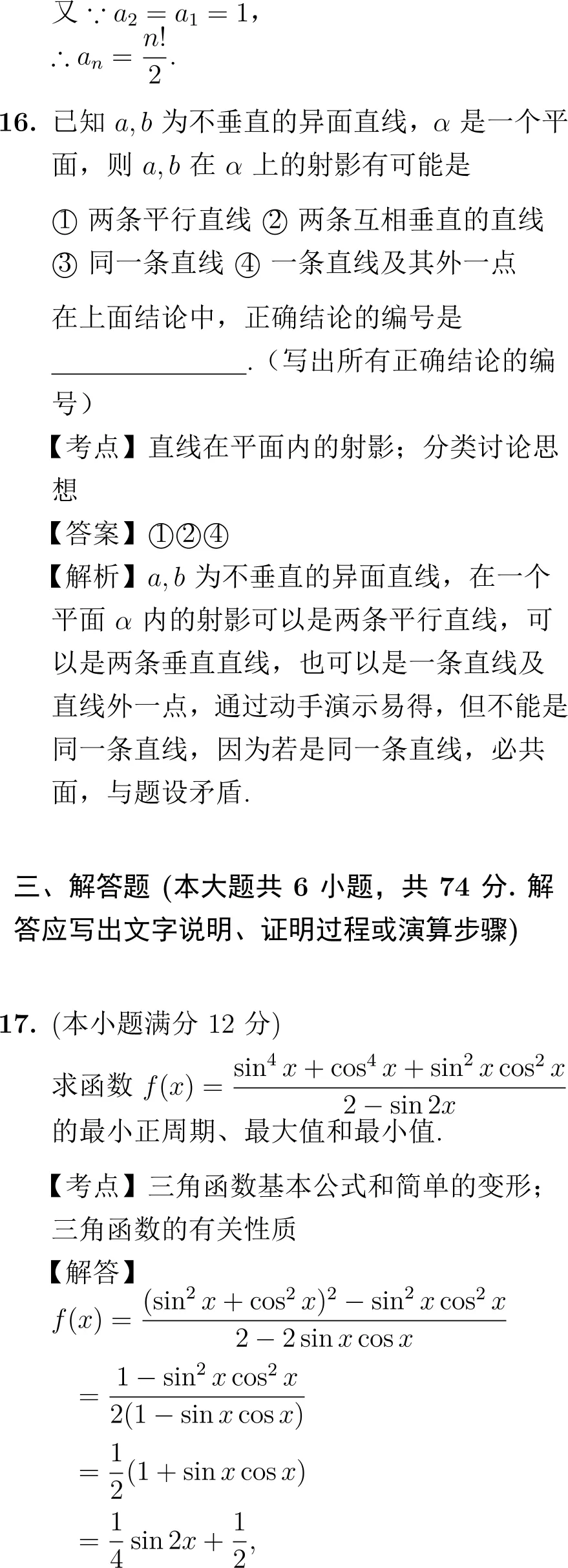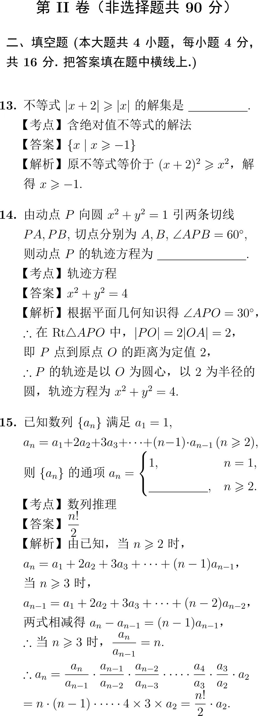 填空题(4题,16分)侧重逻辑推理与轨迹分析,如第14题动点P到圆心距离恒定推导轨迹方程,第15题递推数列通项公式的归纳法处理,第16题空间直线射影的分类讨论,均要求考生具备较强的抽象思维与转化能力。其中第15题通过构造差分项消元得出阶乘形式通项,是典型的“由特殊到一般”思维训练。