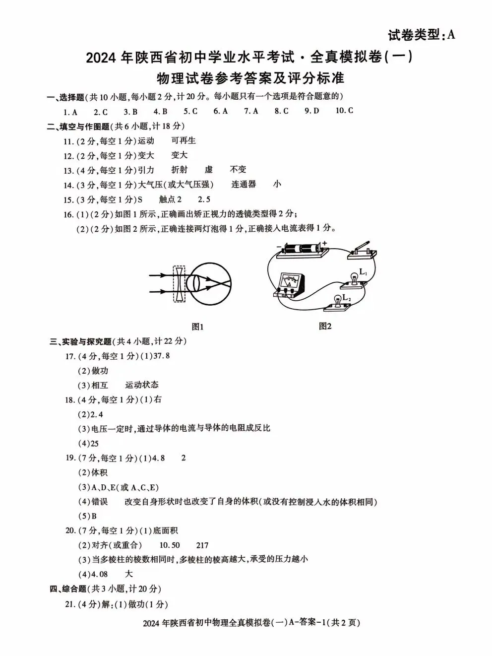 >中考物理模拟试卷答案解析
