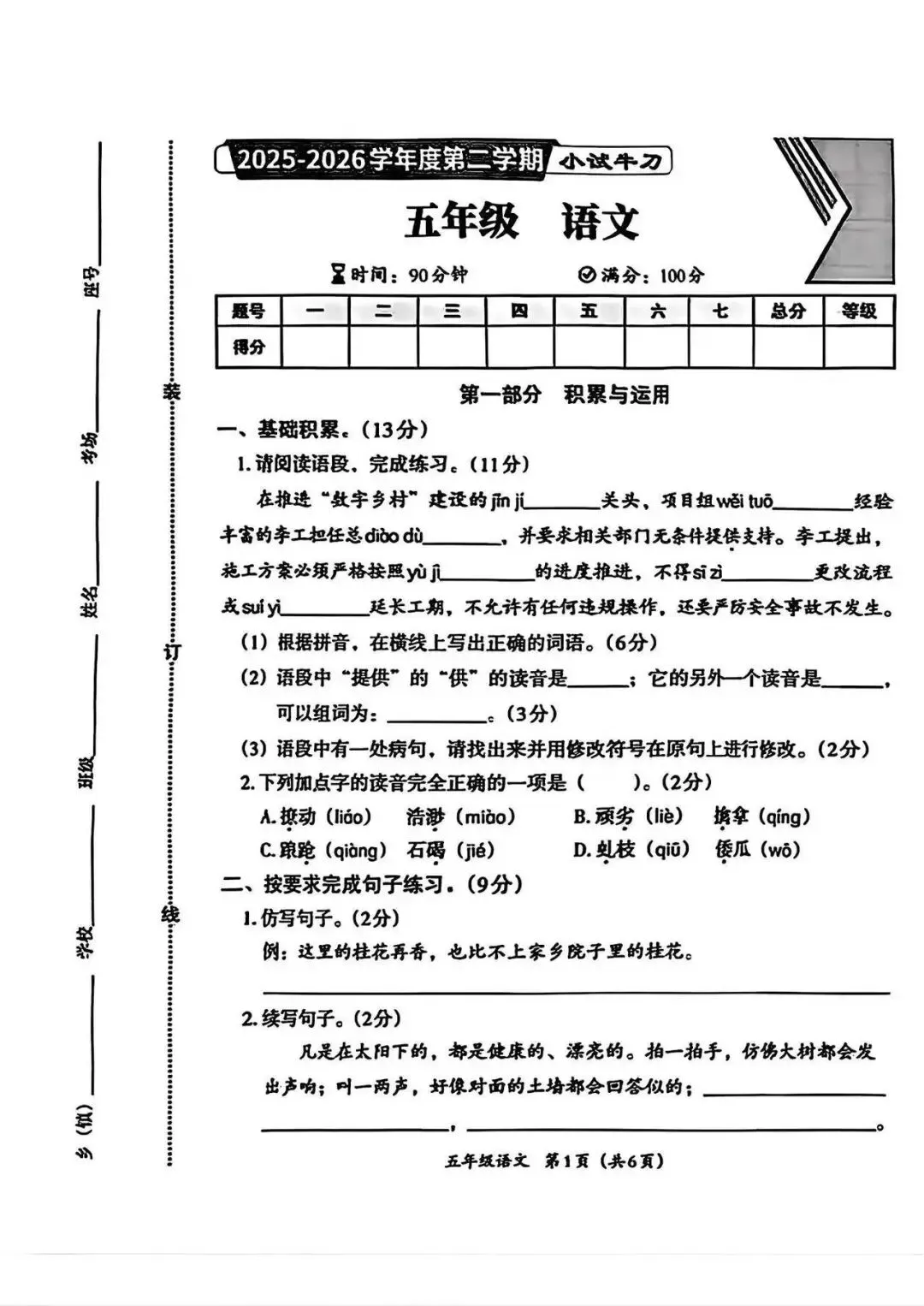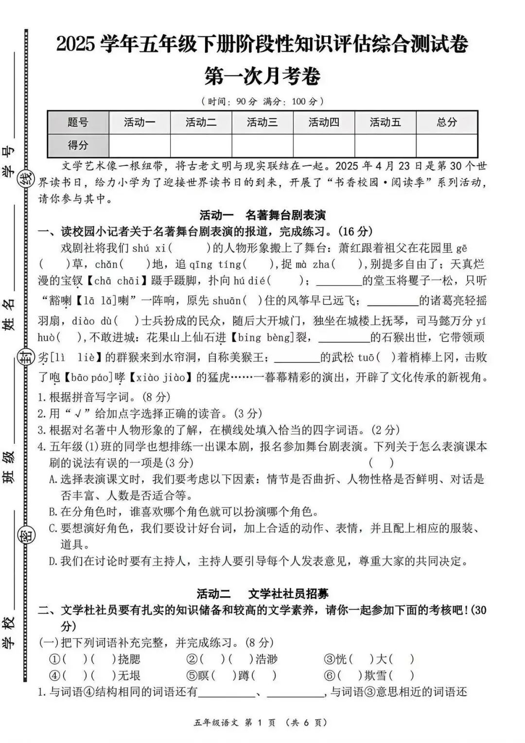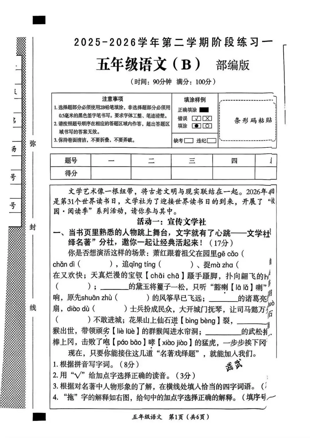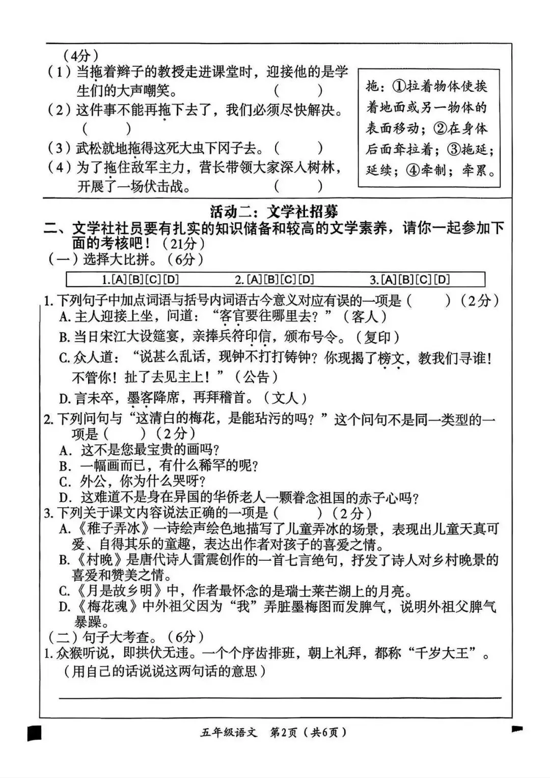 大家好我是白菜学库;今天跟大家分享的是;26春五年级下册语文第一次月考试卷及答案(1~2单元阶段测评),提供电子版,支持打印和下载。