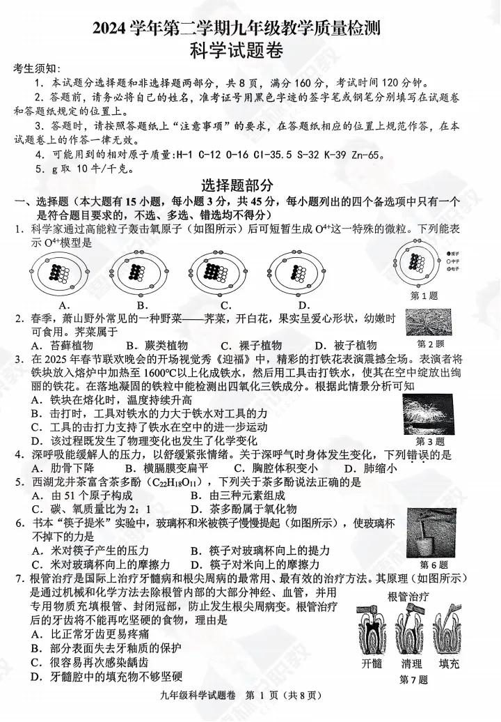 各位初三家长、同学们看过来✨ 备考冲刺关键期,真题加持才高效!今天给大家整理好了2025年浙江省杭州市萧山区一模科学试卷+答案解析,搭配完整详细解析,免费分享给大家~