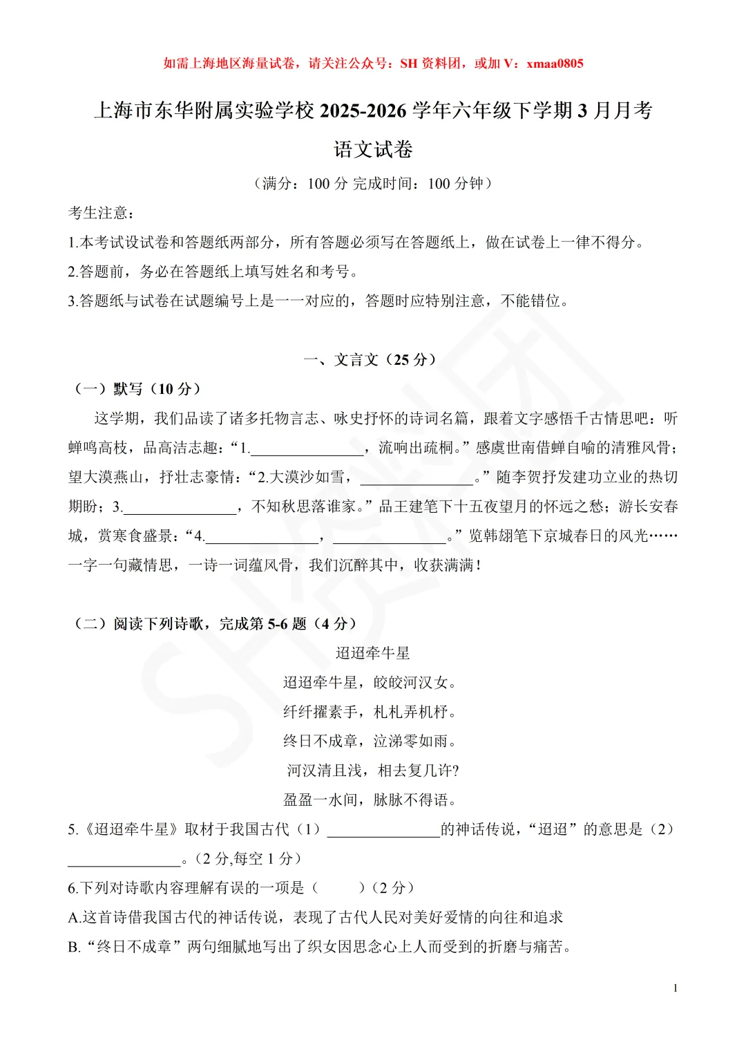 【SH初中语文试卷群更新】上海市东华附属实验学校2025-2026学年六年级下学期3月月考语文