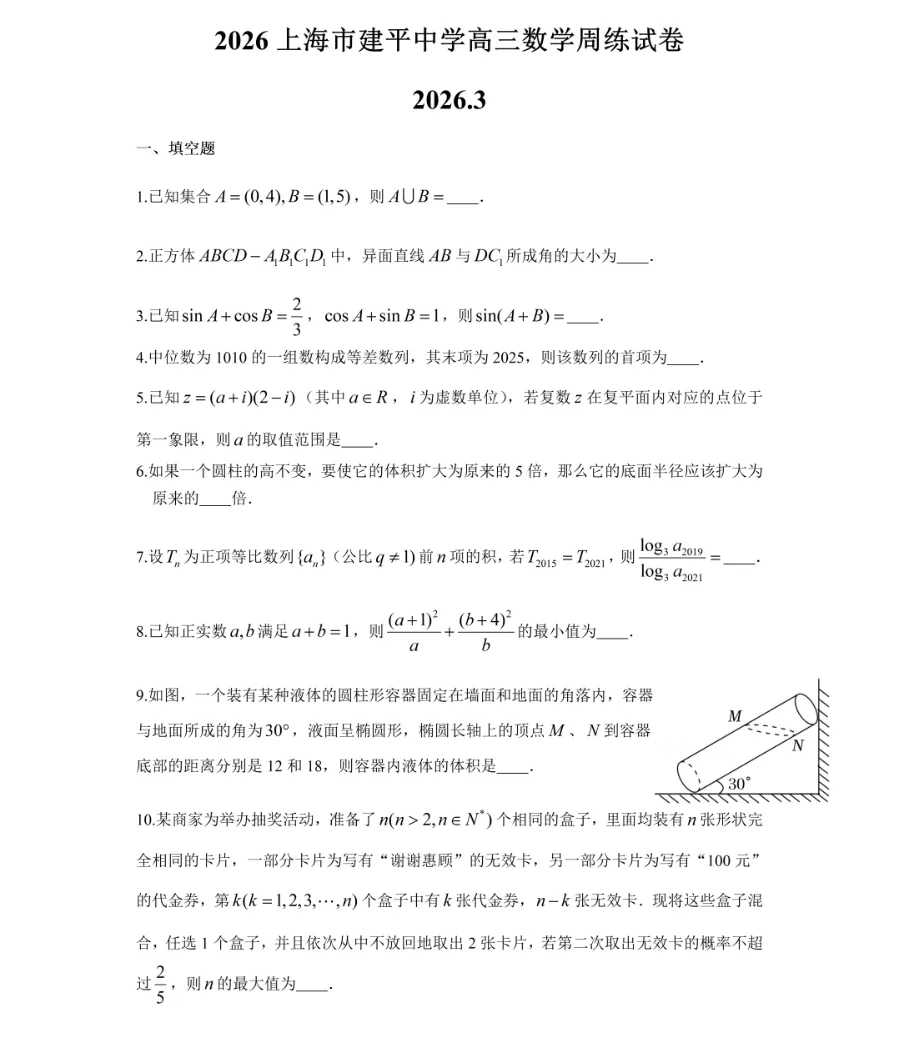 2026届建平中学高三第二学期周练数学试卷2026.3