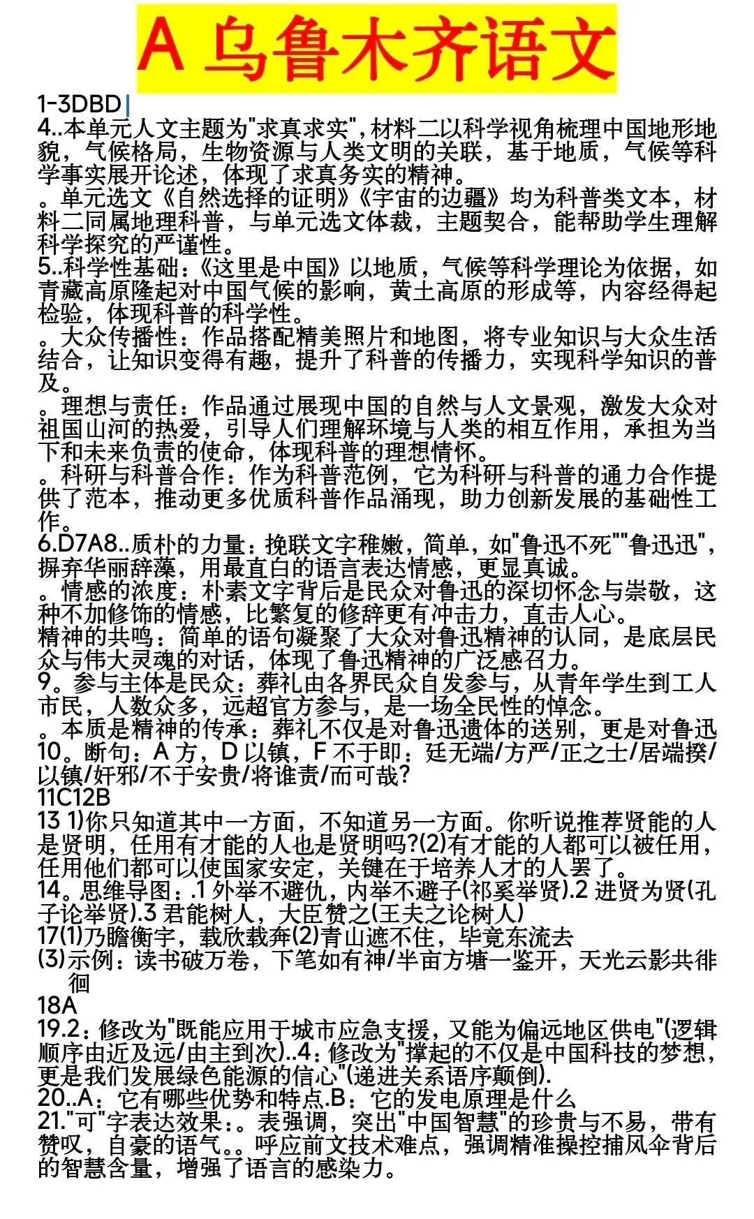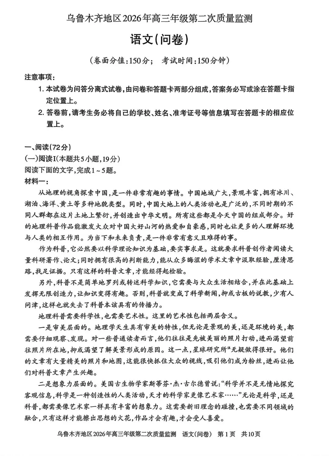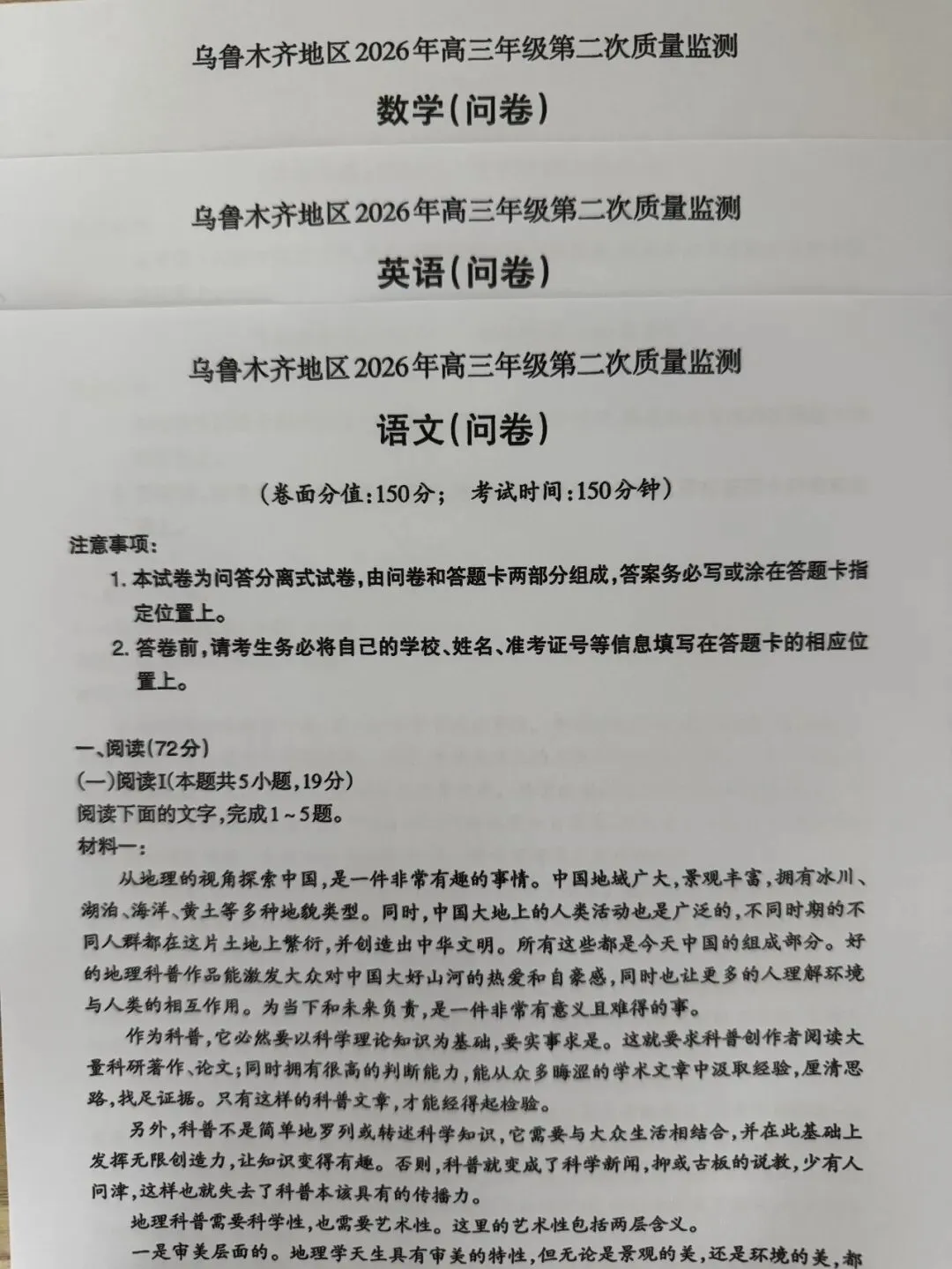 【试卷+答案】乌鲁木齐二模乌鲁木齐地区2026年高三年级第二次质量监测全科汇总!