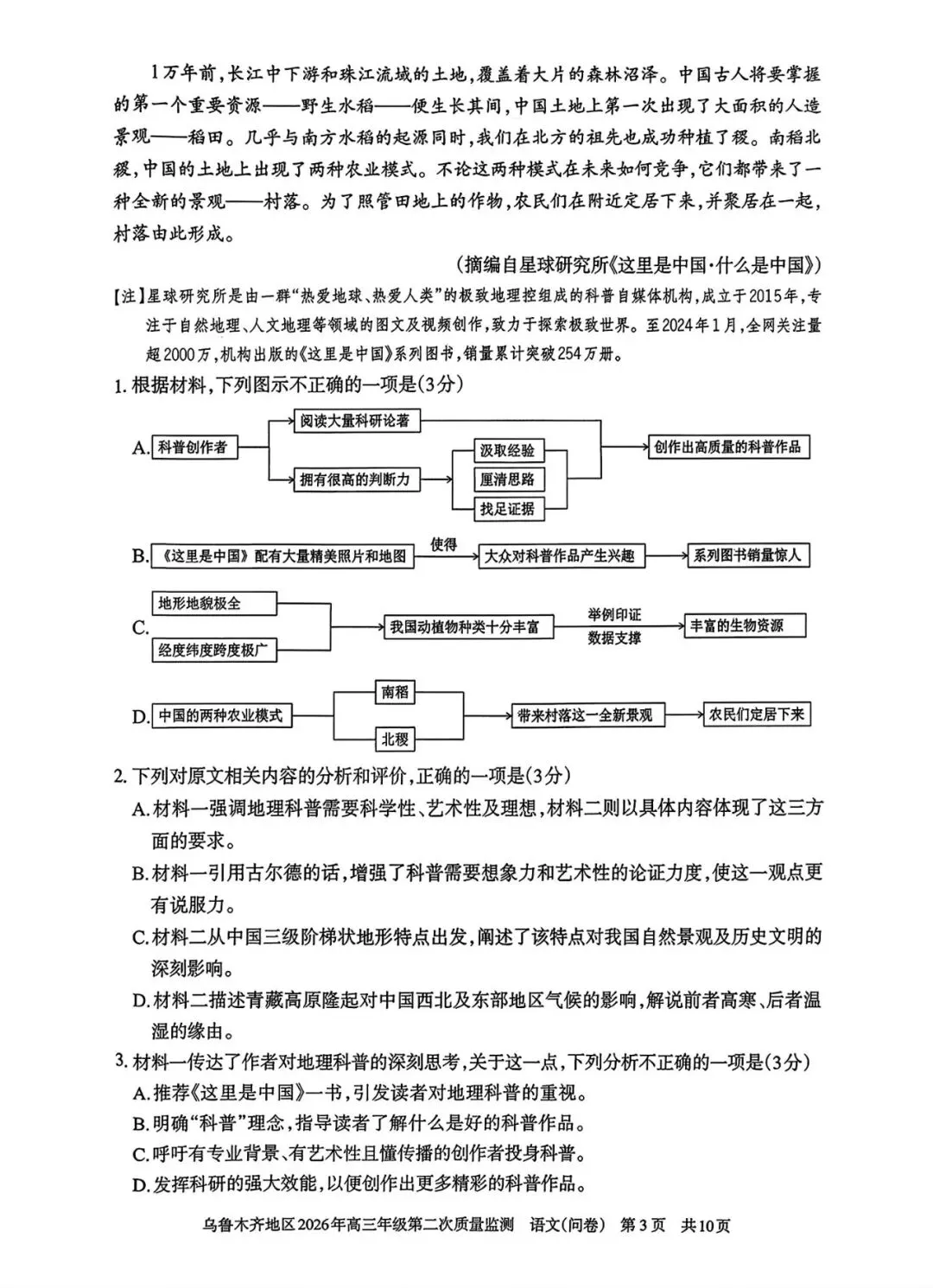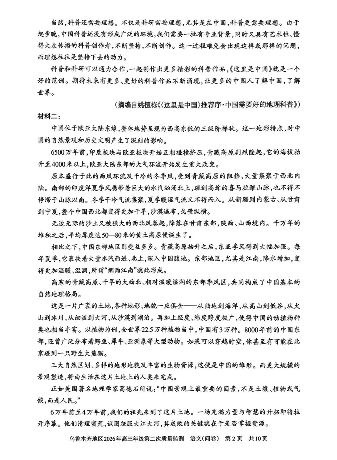 乌鲁木齐二模乌鲁木齐地区2026年高三年级第二次质量监测